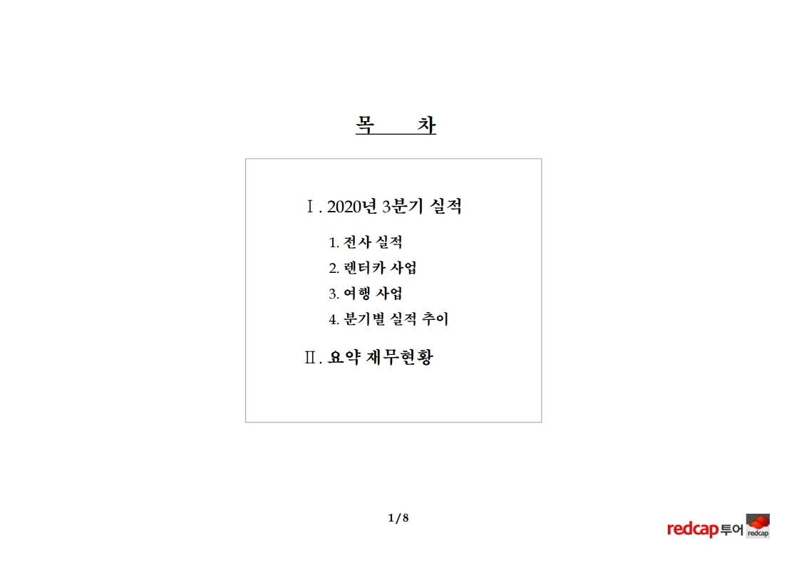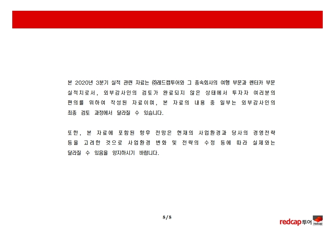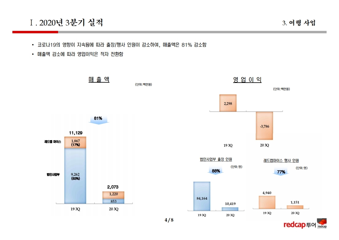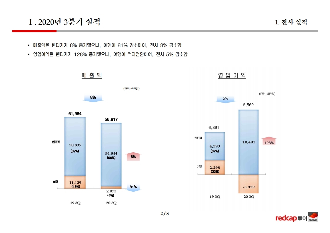 매출액은 렌터카가 8% 증가했으나, 여행은 81% 감소하였음.