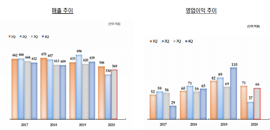 코로나19의 영향으로 전사매출액과 영업이익은 전년대미 모두 감소