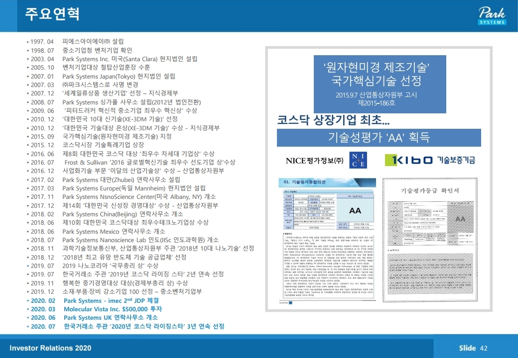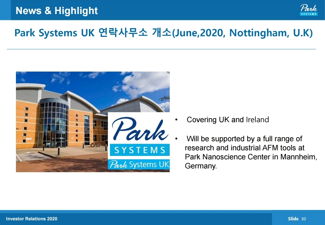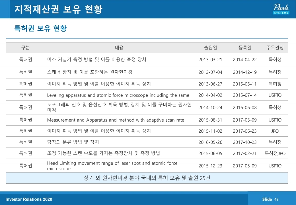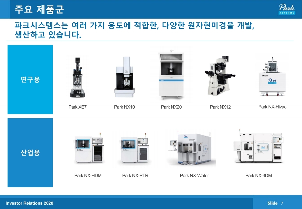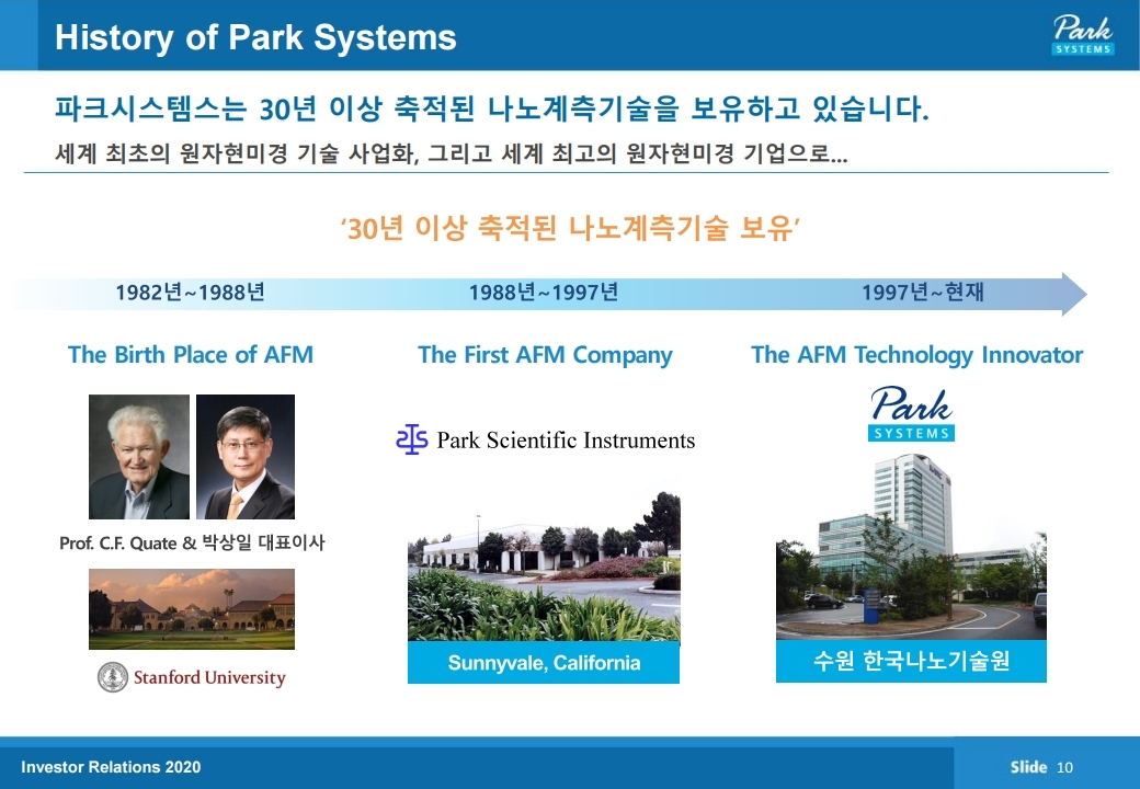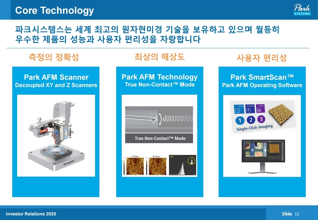 파크시스템스는 원자현미경 (AFM)을 개발, 생산, 판매하는 나노계측기기 전문기업입니다. 본사는 경기도 수원시에 있고 미국, 일본, 중국, 대만, 싱가포르, 독일에 현지판매법인이 있으며, 기타 주요국에 판매망을 가지고 있습니다.