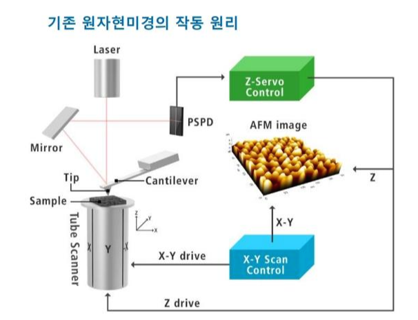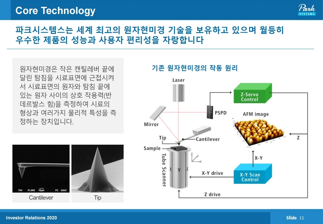 원자현미경은 작은 캔틸레버 긑에 달린 탐침을 시료표면에 근접시켜서 시료표면의 원자와 탐침 끝에 있는 원자사이의 상호작용력 (반데르발스 힘)을 측정하여 시료의 형상과 여러가지 물리적 특성을 측정하는창지이며, 파크시스템스는 세계 최고의 원자현미경 기술을 보유하고 있습니다.