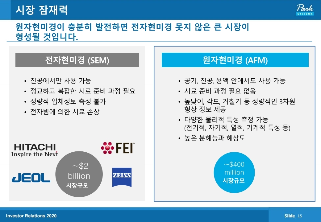 원자현미경의 발전이 가속화된다면 현재 주류를 이루고 있는 전자현미경 (SEM)을 대체할만한 큰 시장이 형성될 것으로 예상됩니다. 하지만 아직까지 분명 시장의 주류는 전자현미경이고 원자현미경으로의 변화는 일종의 니치(대체)시장으로 보입니다.