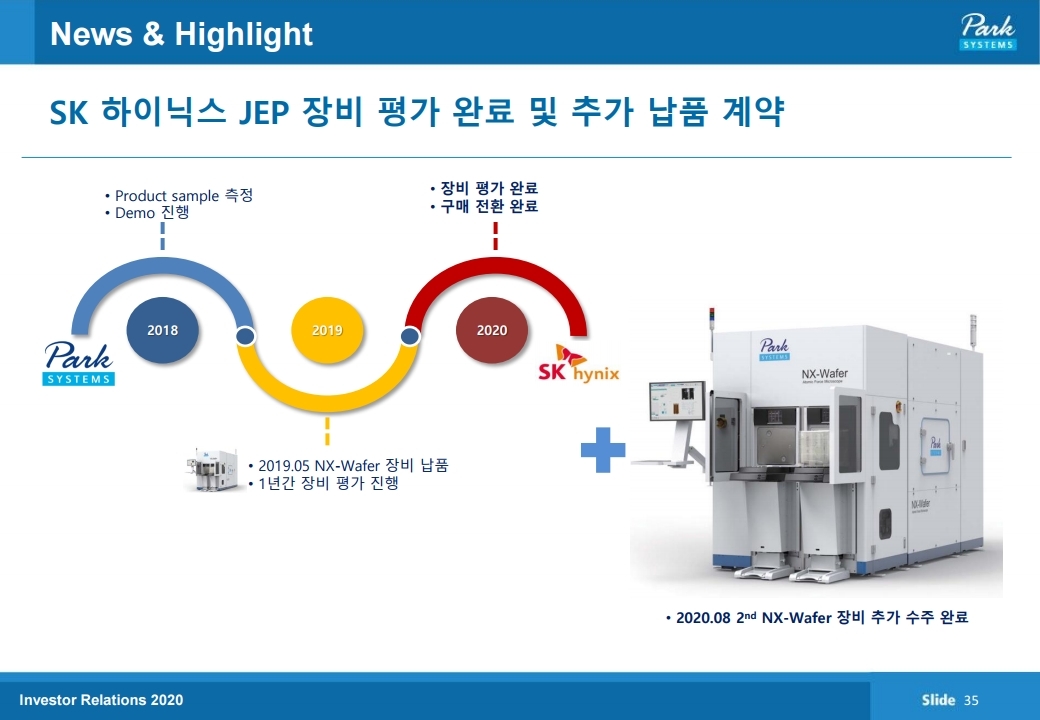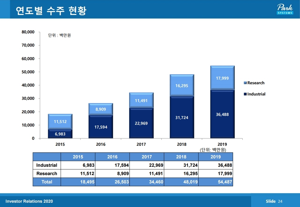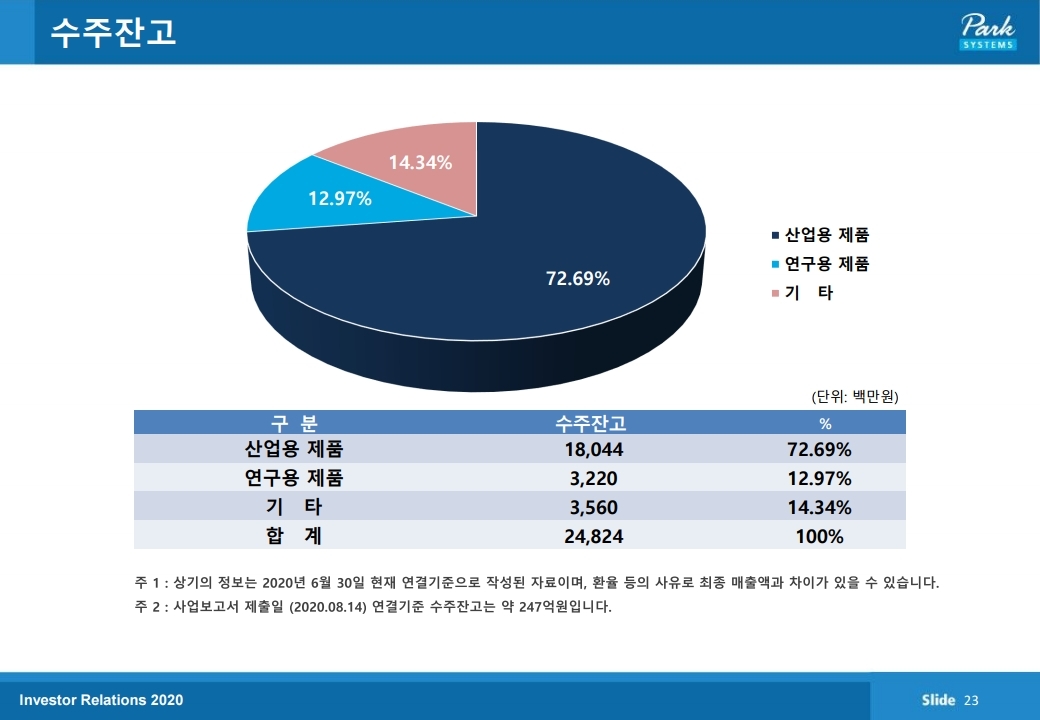 실적의 swing factor는 산업용 원자현미경이다. 별도 실적 기준 산업용 원자현미경 매출은 분기 기준으로 2018년 4분 기와 2019년 1분기에 연구용 원자현미경 매출을 하회하기도 했으나 이후 2019년 2분기부터 현재까지 산업용 매출이 연 구용 매출을 상회하고 있다. 2020년 2분기 기준 산업용 매 출은 127억 원으로 연구용 매출 44억 원 대비 2.8배이다. 6 월 말 기준 수주잔고는 산업용 180억 원, 연구용 32억원, 기타 35억 원이다. 전 세계 현미경 시장에서 원자현미경 점 유율이 광학현미경 및 전자현미경 대비 증가하고 있으며, 초 기에 파크시스템스의 원자현미경을 시범적으로 사용했던 고 객사들이 원자현미경의 적용처를 늘리고 있다.