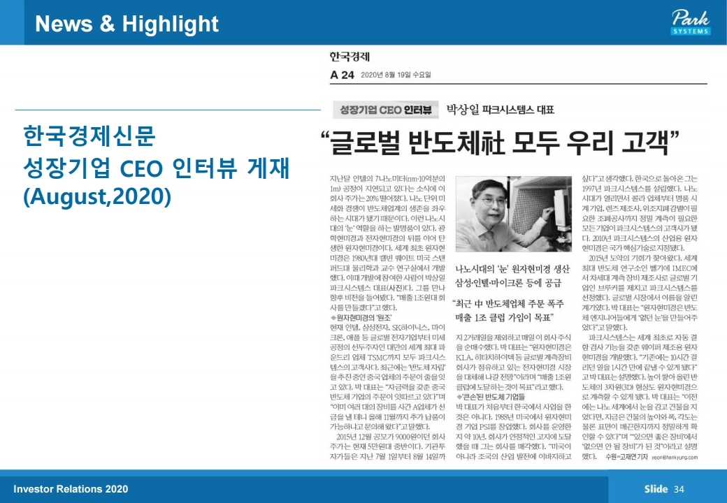 파크시스템스는 원자현미경을 개발, 생산, 판매하는 나노계 측기기 전문 기업이다. 지난 9/4, 온라인 IR을 진행했는데 이후 중국 반도체 파운드리 1위 공급사 SMIC에 대한 미국 측의 제재 가능성이 대두되면서 파크시스템스가 투자자들의 주목을 받을 것으로 판단된다. 미중 무역갈등이 지속되는 가 운데 중국 로컬 반도체 시장에서 미국 공정장비(계측장비) 공급사를 대체할 수 있는 원천기술과 고객사 레퍼런스를 갖 추고 있기 때문이다. SMIC 관련 뉴스 보도 이후 미국 필라 델피아 반도체지수 내에서 공정장비 공급사(KLA 텐코, Lam Research, AMAT) 주가는 1주일 동안 각각 -19.1%, - 17.0%, -15.2% 하락했다. 파크시스템스와 경합 강도가 높 은 기업은 KLA 텐코이다. 파크시스템스의 지역별 매출 중 에서 중화권(대만 포함) 매출비중은 30% 내외로 추정된다.