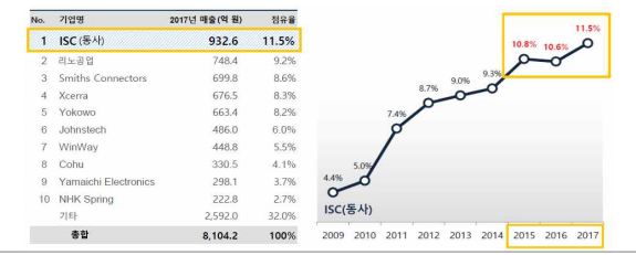ISC(이하 동사)는 2003년 반도체 테스트 소켓의 한 종류인 실리콘 러버형 소켓을 세계 최초로 상용화하여 삼성전자 및 SK하이닉스의 협력업체로 성장의 토대를 마련하였다. 2014년에는 실리콘 러버형 소켓 2위 업체인 일본의 JMT를 인수(357건의 특허 포함)하여 해당 분야에서의 입지를 확고히 하였으며, 이후 인텔, 퀄컴, 애플 등의 해외 업체를 고객사로 확보하며 2015년부터 현재까지 세계 테스트 소켓 시장점유율 1위를 유지하고 있다.