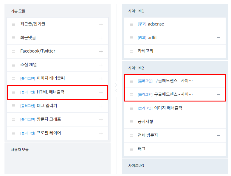 티스토리블로그 관리 - > 사이드바 -> 모듈에서 [광고] 애드센스와 애드핏을 사이드바에 적용시켜 줍니다.