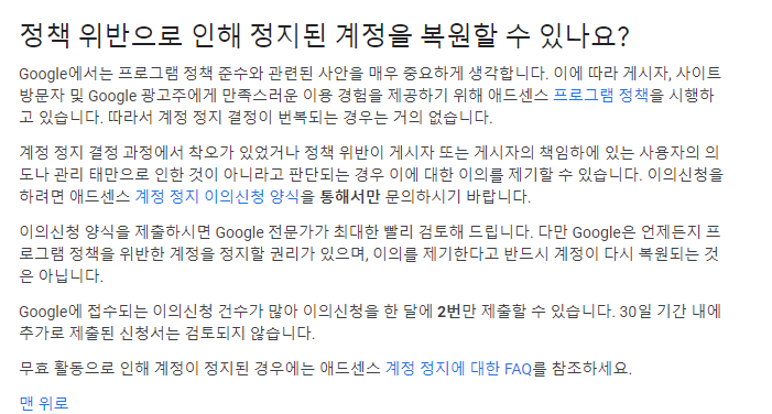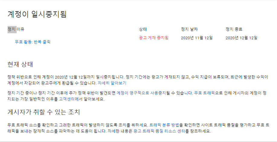 두둥, 광고 게재 중지. 계정이 일시 중지됨. 현재 상태는 정책 위반으로 인해 계정이 2020년 12월 12일까지 일시중지됩니다. 정지 기간에는 광고가 게재되지 않고, 수익 지급이 보류되며, 최근에 발생한 수익이 계정에서 차감되어 광고주에게 환급될 수 있습니다. 정지 기간 중이나 정지 기간 이후에 추가 정책 위반이 발견되면 계정이 영구적으로 사용 중지될 수 있습니다. 무효 트래픽으로 인해 게시자의 계정이 정지되는 가장 일반적인 이유를 고객센터에서 알아보세요. 라고 하지만 고객센터에 알아볼 것도 없니, 내가 직접 무효트래픽을 만들어낸 격이니... 할말이 없는건 마찬가지지~
