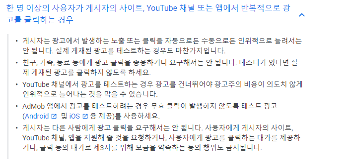 - 친구, 가족, 동료 등에게 광고 클릭을 종용하거나 요구해서는 안 됩니다. 테스터가 있다면 실제 게재된 광고를 클릭하지 않도록 하세요.