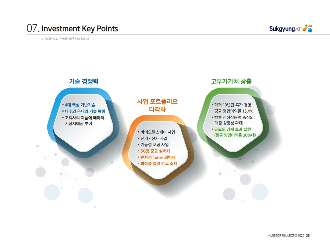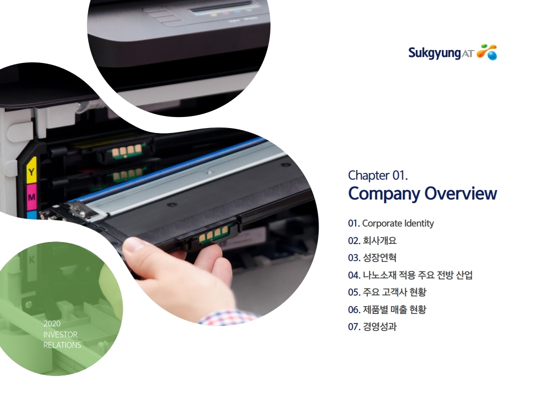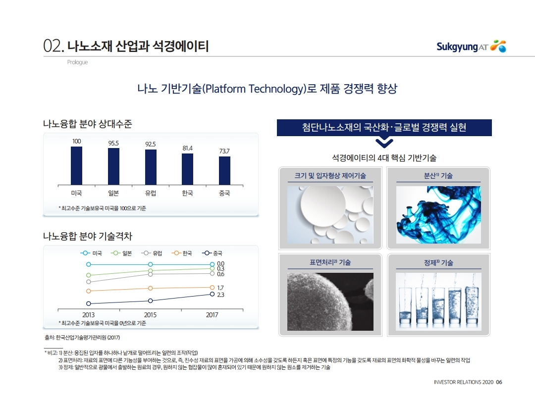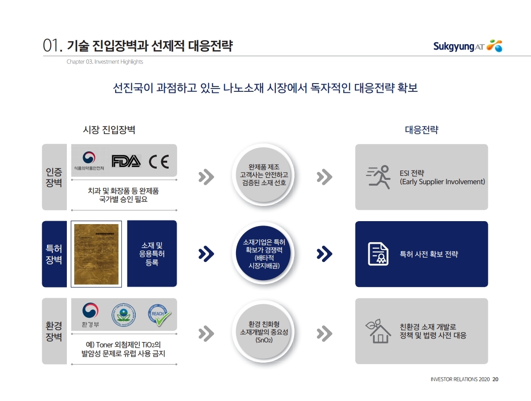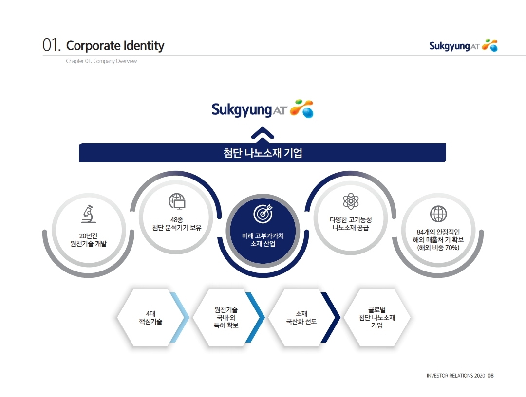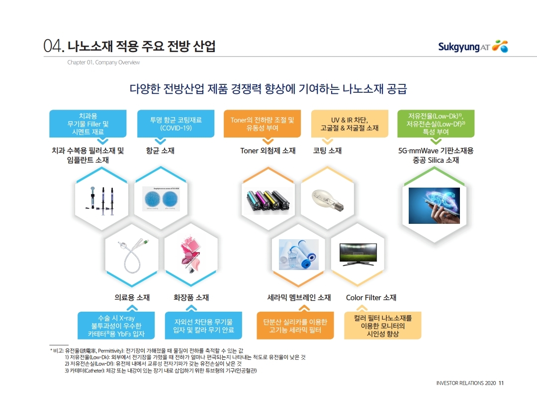 석경에이티(Sukgyung AT)는 덴탈용 기능성 필터, 토너 외첨제, 기능성 코 팅제 등 다양한 고기능성 나노 소재를 개발/생산하는 첨단 나노소재 전문 기업임. 현재 덴탈용 기능성 필터 YbF3 주1 , BAG&SRG주2와 토너 외첨제 소 재 SiO2(silica)주3 등이 동사의 주요 제품군인데, 세계 20개국, 84개 안정적 인 해외 매출처에 공급 중이며, '19년 매출액 기준 수출 비중이 70%에 달 하는 선진국(미국, 독일, 프랑스, 일본 등)의 기업들이 과점한 나노 소재 시 장에서 선전하고 있는 국가대표 강소기업임. 동사는 20여년 간 나노 소재에 대한 연구개발과 투자로 고기능의 소재 혁 신을 선도하고 있는데, 특히 원료 고순도 정제기술은 고부가가치 제품 창출 의 핵심 경쟁력으로 꼽을 수 있음. 동사는 지난 10년간 연속 흑자 경영을 기반으로 안정적인 연구개발을 통한 고부가의 신제품을 출시하고 있는데, 높은 기술력과 나노 소재의 경쟁력을 인정 받은 소부장(소재/부품/장비) 기 술 특례 기업임(NICE디앤비 A등급, 기술보증기금 BBB등급 취득). 공모희망가액은 8,000~10,000원, 예상 시가총액은 436~546억원. 공모금 액은 80~100억원 예상. 공모자금은 지속적인 나노소재 연구개발비, 매출 증대를 위한 시설자금, 일부 상환자금에 사용할 예정임. 상장예정일은 '20 년 12월 23일.