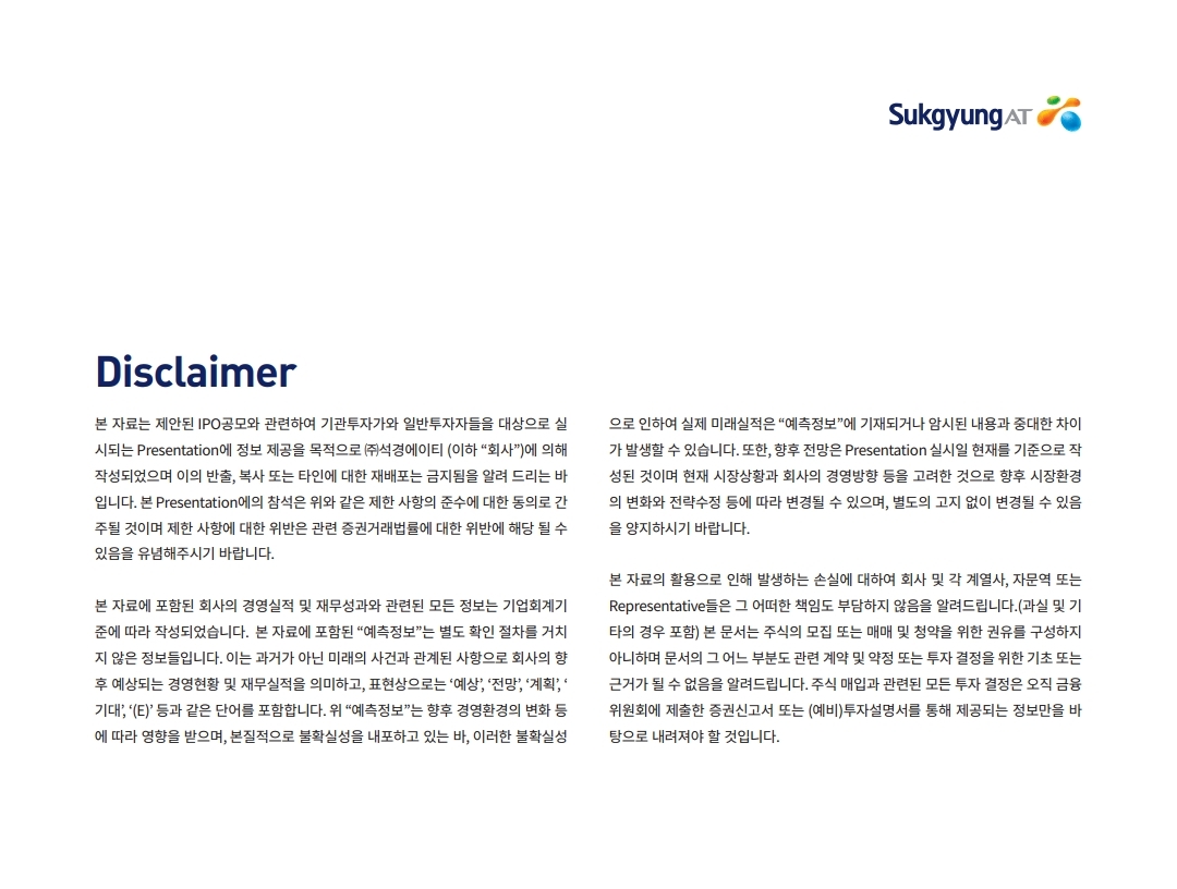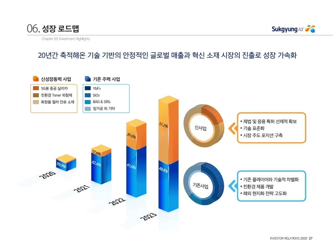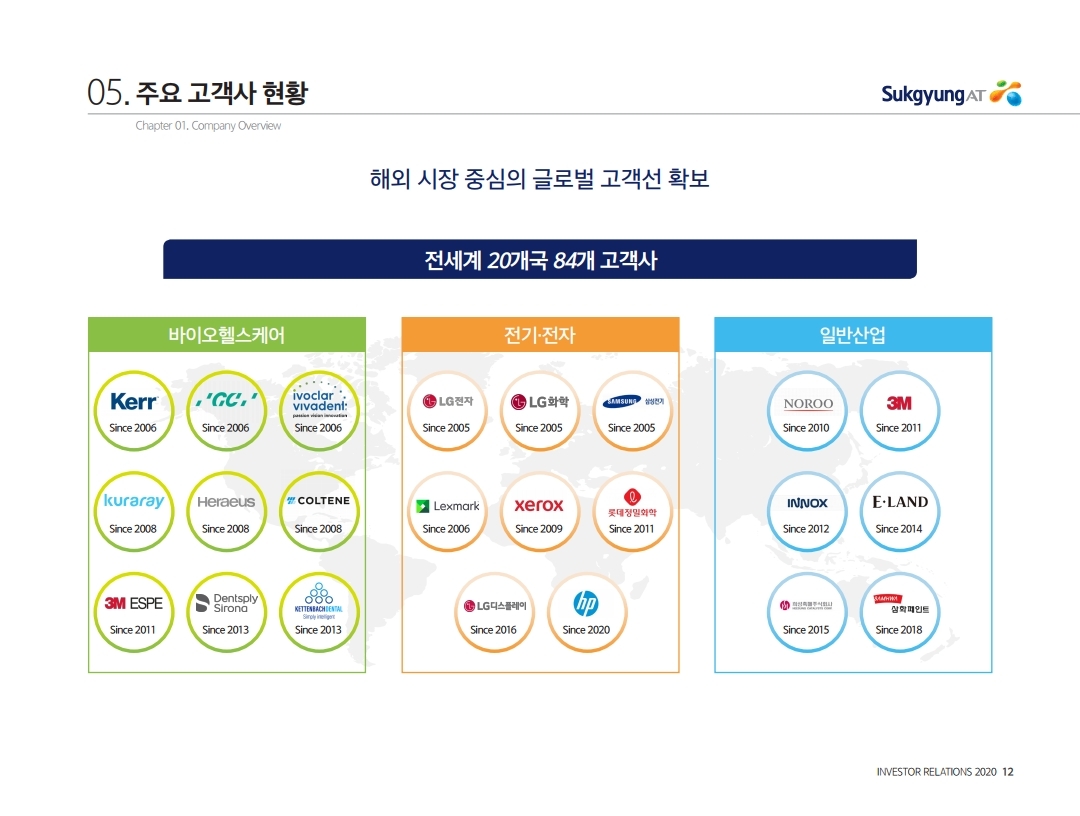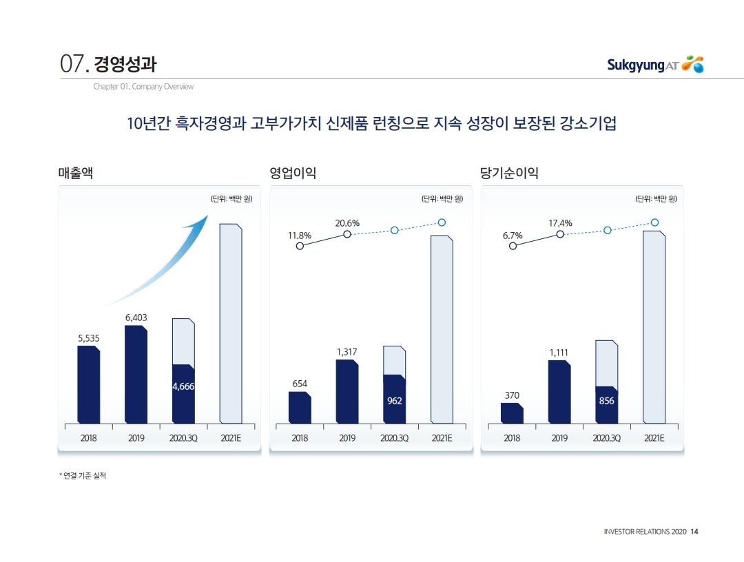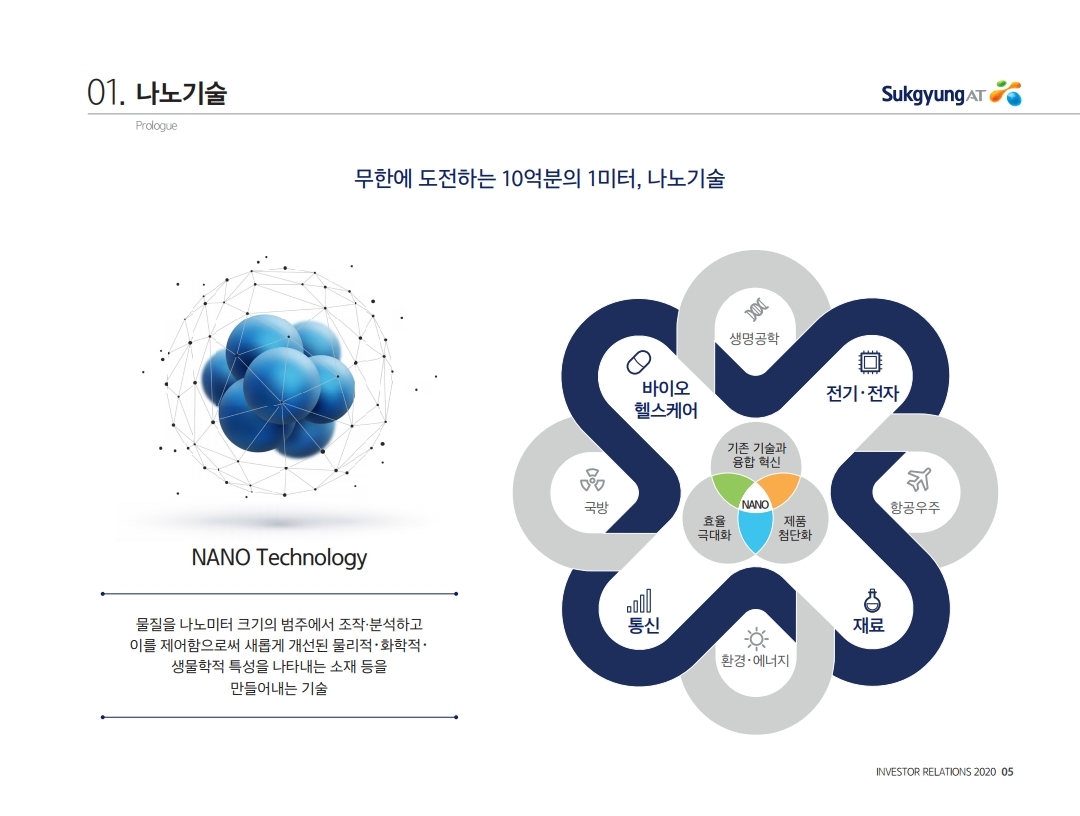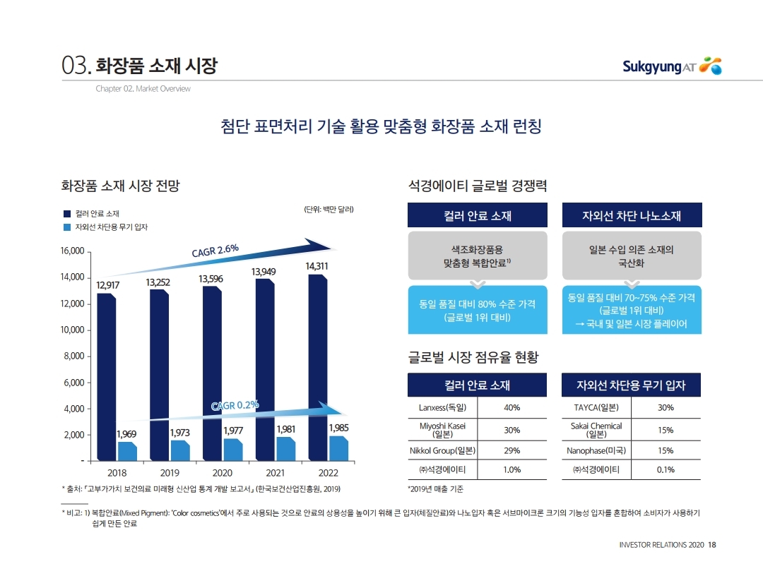 석경에이티(Sukgyung AT)는 덴탈용 기능성 필터, 토너 외첨제, 기능성 코 팅제 등 다양한 고기능성 나노 소재를 개발/생산하는 첨단 나노소재 전문 기업임. 현재 덴탈용 기능성 필터 YbF3 주1 , BAG&SRG주2와 토너 외첨제 소 재 SiO2(silica)주3 등이 동사의 주요 제품군인데, 세계 20개국, 84개 안정적 인 해외 매출처에 공급 중이며, '19년 매출액 기준 수출 비중이 70%에 달 하는 선진국(미국, 독일, 프랑스, 일본 등)의 기업들이 과점한 나노 소재 시 장에서 선전하고 있는 국가대표 강소기업임. 동사는 20여년 간 나노 소재에 대한 연구개발과 투자로 고기능의 소재 혁 신을 선도하고 있는데, 특히 원료 고순도 정제기술은 고부가가치 제품 창출 의 핵심 경쟁력으로 꼽을 수 있음. 동사는 지난 10년간 연속 흑자 경영을 기반으로 안정적인 연구개발을 통한 고부가의 신제품을 출시하고 있는데, 높은 기술력과 나노 소재의 경쟁력을 인정 받은 소부장(소재/부품/장비) 기 술 특례 기업임(NICE디앤비 A등급, 기술보증기금 BBB등급 취득). 공모희망가액은 8,000~10,000원, 예상 시가총액은 436~546억원. 공모금 액은 80~100억원 예상. 공모자금은 지속적인 나노소재 연구개발비, 매출 증대를 위한 시설자금, 일부 상환자금에 사용할 예정임. 상장예정일은 '20 년 12월 23일.