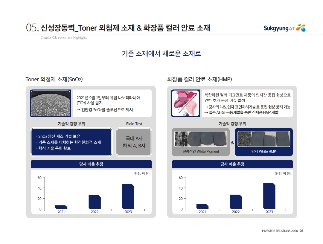 동사는 20년간 축적해온 기술이 집약된 고부가 기존 제품 매출 위에 고부 가의 신성장 제품군의 매출이 가속화하여 더해지는 고성장의 진입 단계임. 증권신고서(추정 손익계산서)에 따르면, 5G 기판소재용 중공 실리카, 친환 경 토너 외첨제 소재, 화장품 컬러 안료 소재(HMP)의 실적 기여가 본격화 되어 '21년 매출액 112억원, 영업이익 32억원→ '22년 매출액 167억원, 영 업이익 57억원을 추정함. 예상순이익 기준 공모희망가는 '21년 PER 16.0~20.1배, '22년 PER 8.8~11.0배 예상. 소재 기술 기반의 ‘흑자 기술 성 평가 기업’이라는 장점은 공모는 물론 상장 후 주가 흐름에 긍정적인 매 력으로 작용할 전망임.