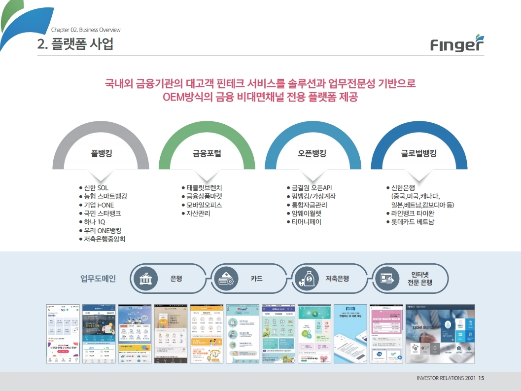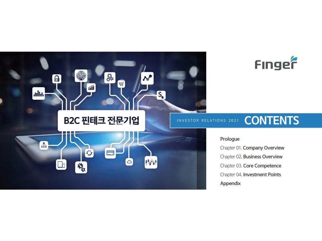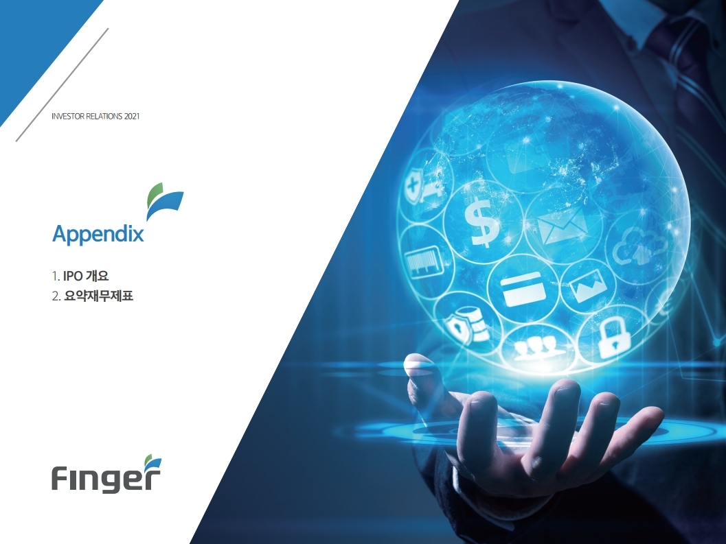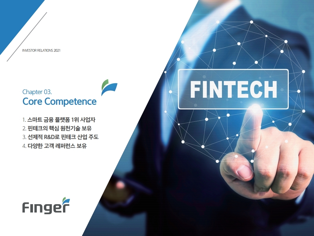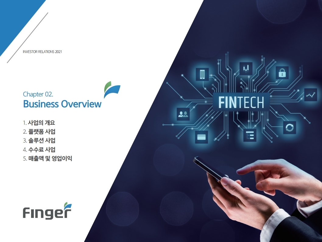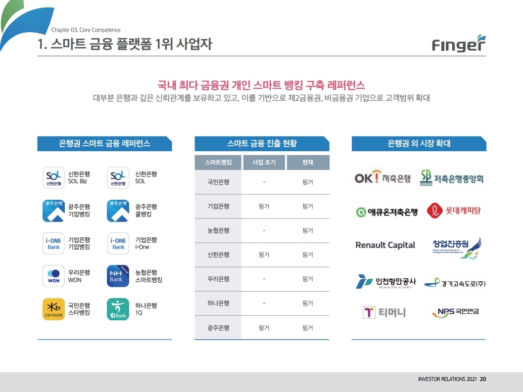 핑거(Finger)는 금융 플랫폼, 솔루션(서비스), 수수료(CMS) 등 금융 비대면 채널 전용 플랫폼을 제공하는 핀테크 전문 기업임.'00년 12월 설립되어 20 년 업력 기반 국내 최다 금융권 개인 스마트 뱅킹 구축 레퍼런스(국민, 기 업, 농협, 신한, 우리, 하나, 광주 등)를 보유한 국내 스마트 금융 플랫폼 1 위 사업자라고 할 수 있음. 주요 사업 부문은 OEM 방식의 금융 비대면채널 전용 플랫폼을 제공하는 ①플랫폼 사업(풀뱅킹주1 , 금융포탈주2 , 오픈뱅킹, 글로벌뱅킹)과 디지털 금 융서비스 구현을 위한 기술을 제공하는 ②솔루션 사업(마이데이터, AI기반 보이스피싱 분석, 뱅킹 구축, 송금/결제), 유료 금융서비스를 직접 제공하는 ③수수료 사업(CMS, 빅데이터 중개, 해외송금) 등으로 구성되어 있으며, '20년 3분기 누적 매출액 기준 플랫폼 87%, 솔루션 2.7%, 수수료 3.6%의 비중을 기록함. 공모희망가액은 13,000~15,000원, 예상 시가총액은 1,149~1,326억원. (신주)공모금액은 130~150억원 예상. 공모자금은 기업 인지도 제고 및 경 쟁력 강화를 위한 마케팅 비용, 소비자 금융 플랫폼 등 신규사업과 타법인 (마이앨리)지분 투자에 사용할 예정임. 상장예정일은 '21년 1월 29일.