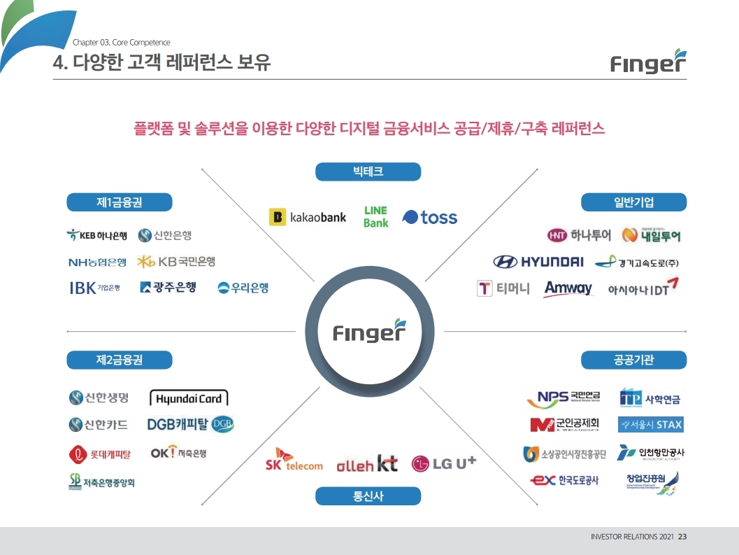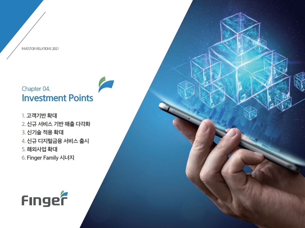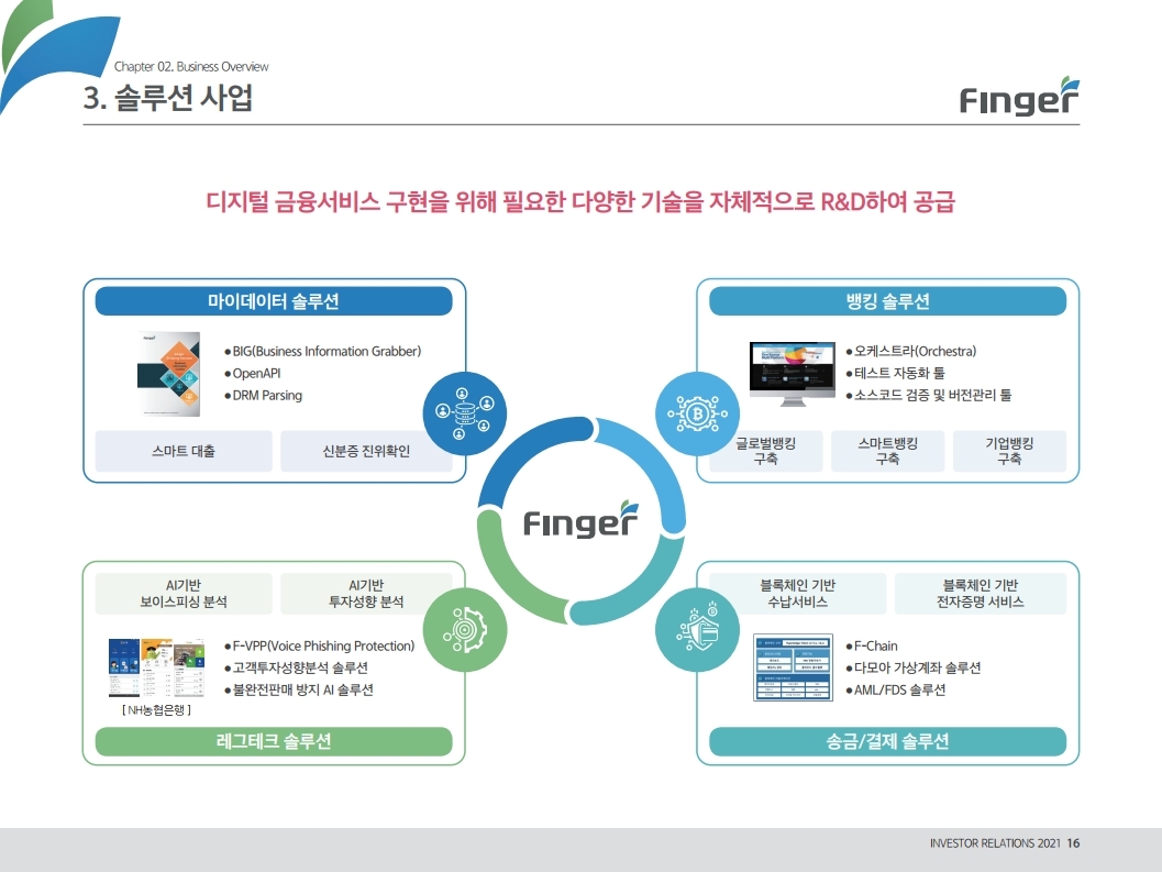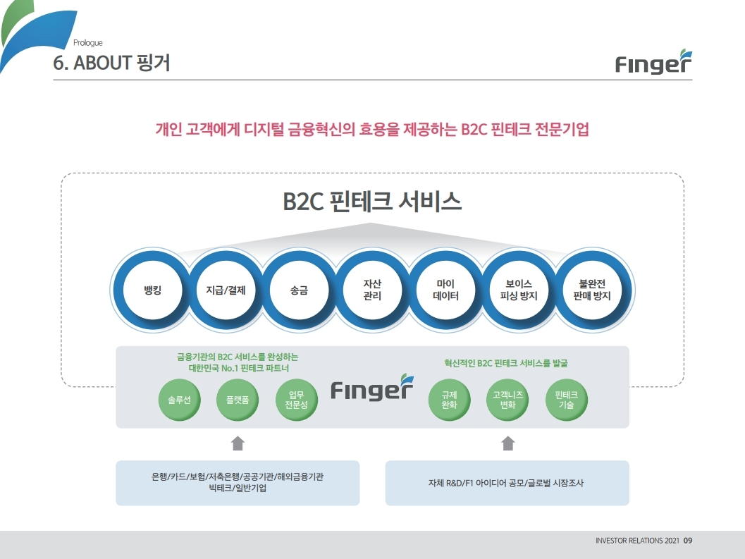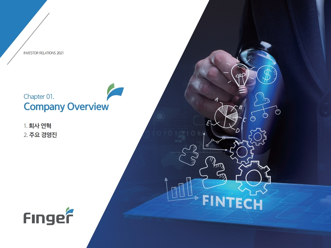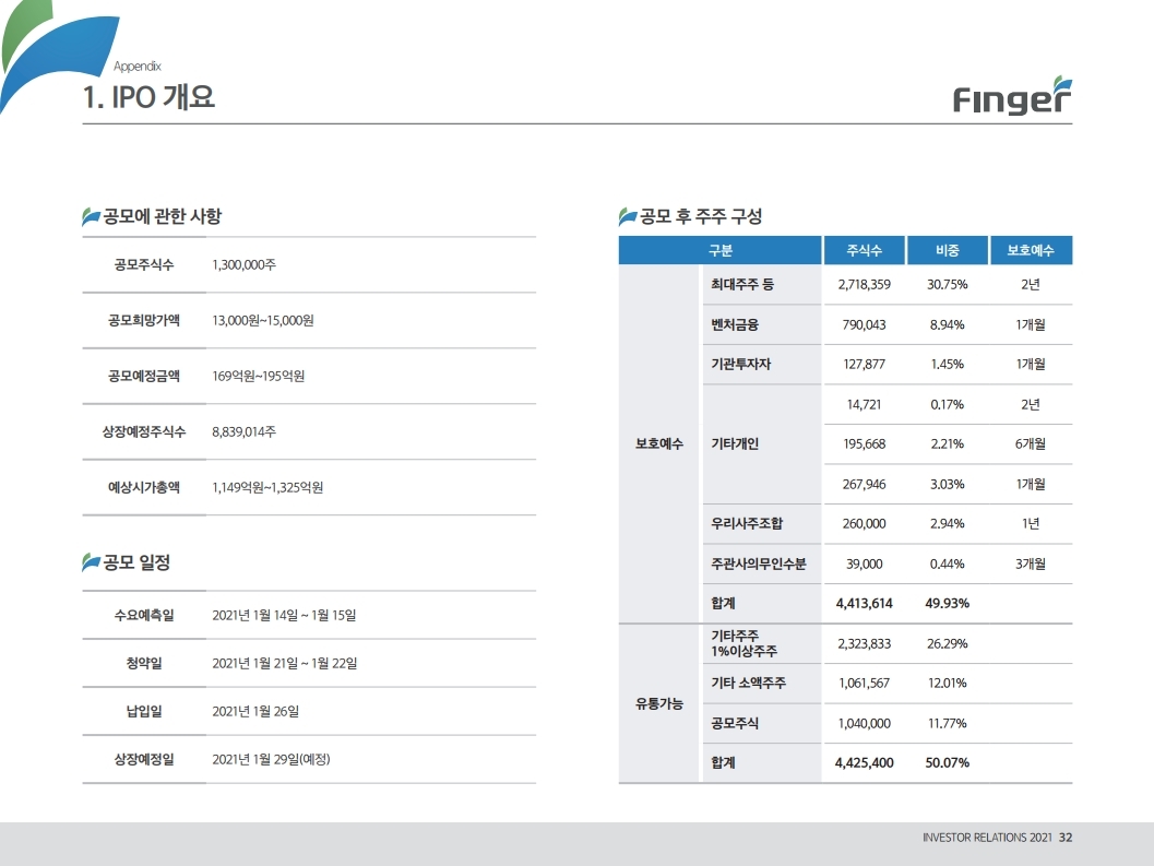 핑거(Finger)는 금융 플랫폼, 솔루션(서비스), 수수료(CMS) 등 금융 비대면 채널 전용 플랫폼을 제공하는 핀테크 전문 기업임.'00년 12월 설립되어 20 년 업력 기반 국내 최다 금융권 개인 스마트 뱅킹 구축 레퍼런스(국민, 기 업, 농협, 신한, 우리, 하나, 광주 등)를 보유한 국내 스마트 금융 플랫폼 1 위 사업자라고 할 수 있음. 주요 사업 부문은 OEM 방식의 금융 비대면채널 전용 플랫폼을 제공하는 ①플랫폼 사업(풀뱅킹주1 , 금융포탈주2 , 오픈뱅킹, 글로벌뱅킹)과 디지털 금 융서비스 구현을 위한 기술을 제공하는 ②솔루션 사업(마이데이터, AI기반 보이스피싱 분석, 뱅킹 구축, 송금/결제), 유료 금융서비스를 직접 제공하는 ③수수료 사업(CMS, 빅데이터 중개, 해외송금) 등으로 구성되어 있으며, '20년 3분기 누적 매출액 기준 플랫폼 87%, 솔루션 2.7%, 수수료 3.6%의 비중을 기록함. 공모희망가액은 13,000~15,000원, 예상 시가총액은 1,149~1,326억원. (신주)공모금액은 130~150억원 예상. 공모자금은 기업 인지도 제고 및 경 쟁력 강화를 위한 마케팅 비용, 소비자 금융 플랫폼 등 신규사업과 타법인 (마이앨리)지분 투자에 사용할 예정임. 상장예정일은 '21년 1월 29일.