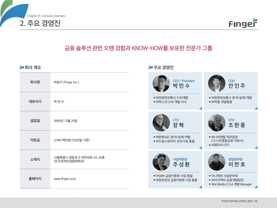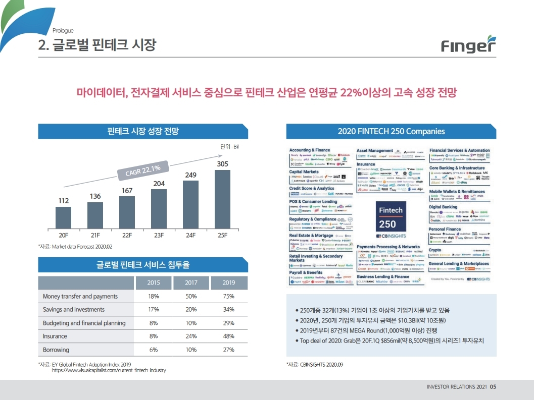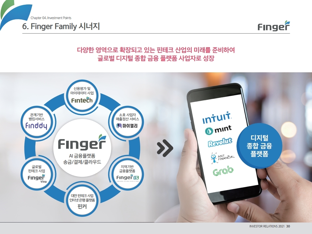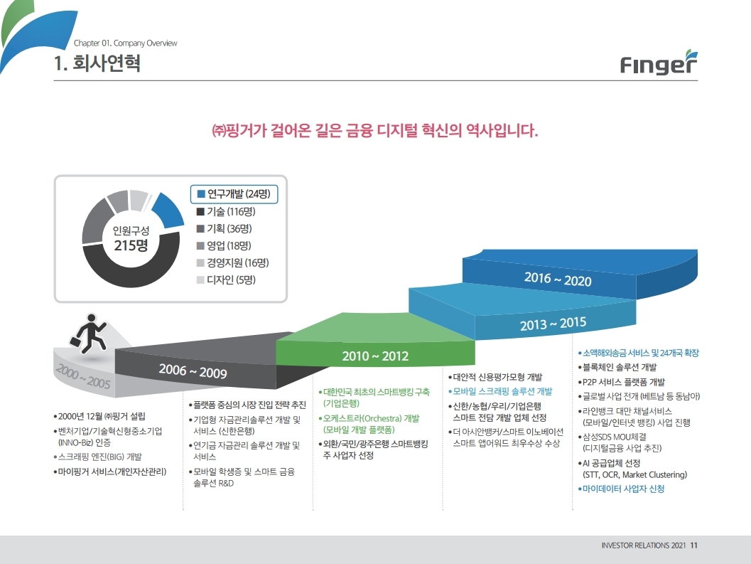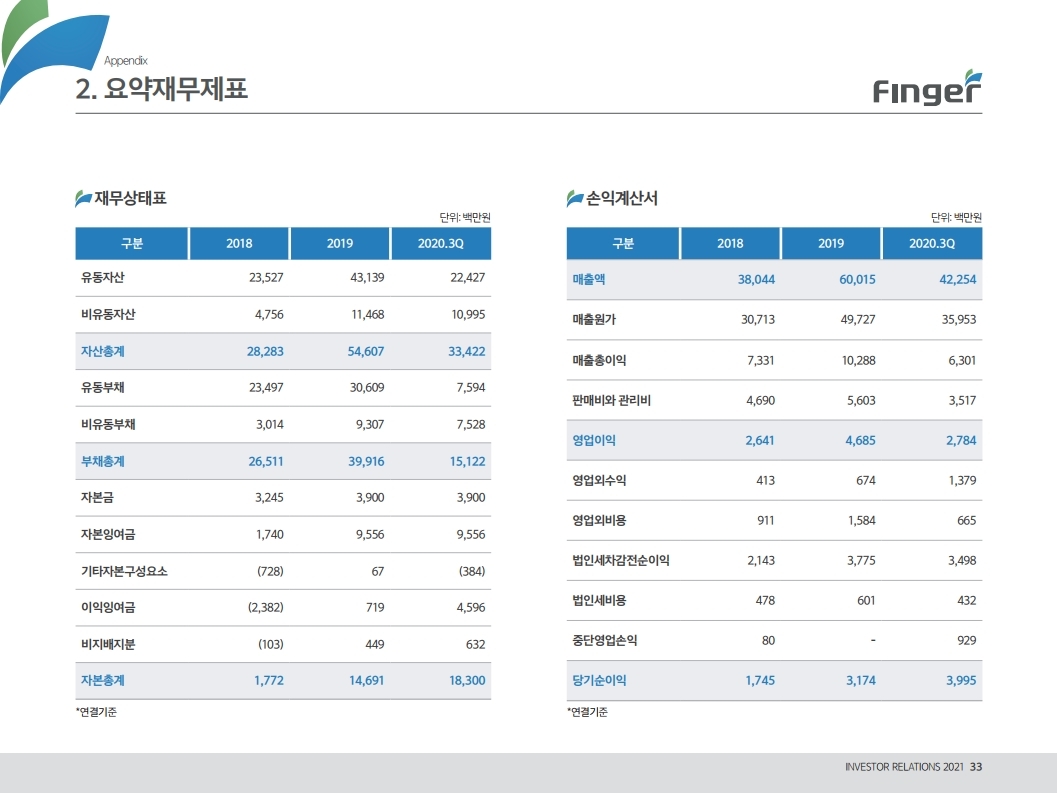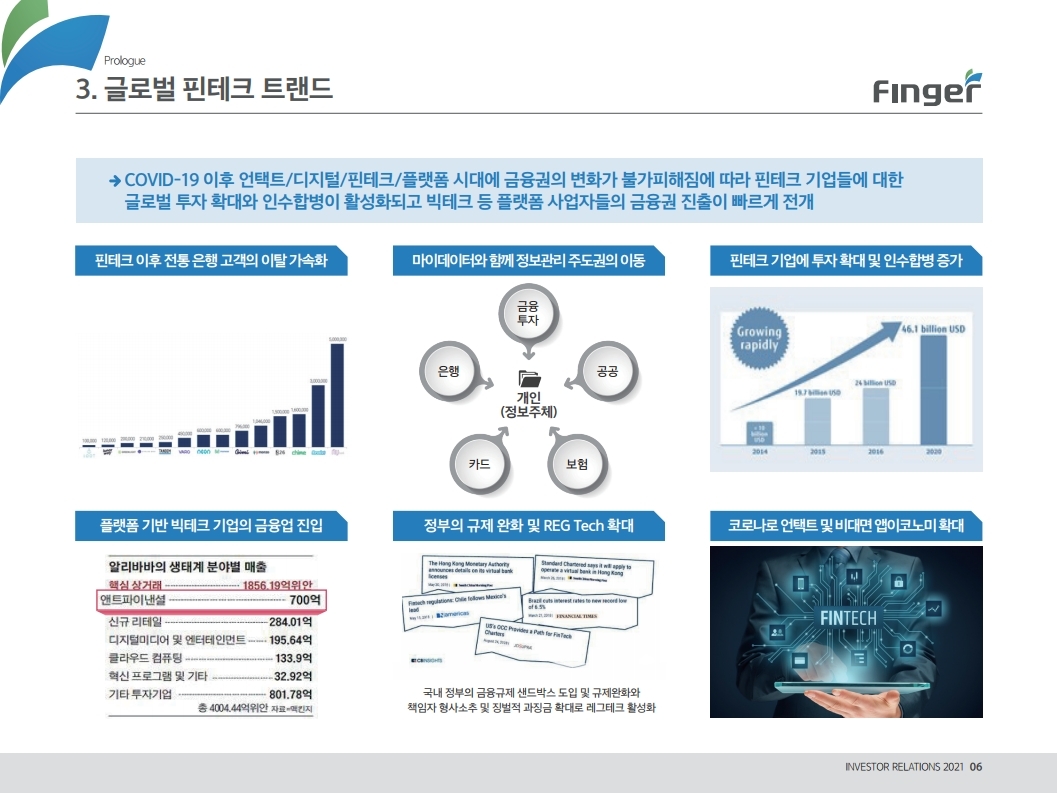 핑거(Finger)는 금융 플랫폼, 솔루션(서비스), 수수료(CMS) 등 금융 비대면 채널 전용 플랫폼을 제공하는 핀테크 전문 기업임.'00년 12월 설립되어 20 년 업력 기반 국내 최다 금융권 개인 스마트 뱅킹 구축 레퍼런스(국민, 기 업, 농협, 신한, 우리, 하나, 광주 등)를 보유한 국내 스마트 금융 플랫폼 1 위 사업자라고 할 수 있음. 주요 사업 부문은 OEM 방식의 금융 비대면채널 전용 플랫폼을 제공하는 ①플랫폼 사업(풀뱅킹주1 , 금융포탈주2 , 오픈뱅킹, 글로벌뱅킹)과 디지털 금 융서비스 구현을 위한 기술을 제공하는 ②솔루션 사업(마이데이터, AI기반 보이스피싱 분석, 뱅킹 구축, 송금/결제), 유료 금융서비스를 직접 제공하는 ③수수료 사업(CMS, 빅데이터 중개, 해외송금) 등으로 구성되어 있으며, '20년 3분기 누적 매출액 기준 플랫폼 87%, 솔루션 2.7%, 수수료 3.6%의 비중을 기록함. 공모희망가액은 13,000~15,000원, 예상 시가총액은 1,149~1,326억원. (신주)공모금액은 130~150억원 예상. 공모자금은 기업 인지도 제고 및 경 쟁력 강화를 위한 마케팅 비용, 소비자 금융 플랫폼 등 신규사업과 타법인 (마이앨리)지분 투자에 사용할 예정임. 상장예정일은 '21년 1월 29일.