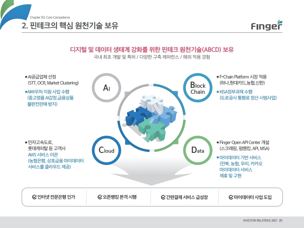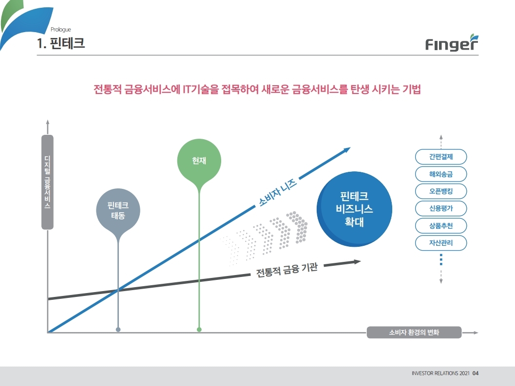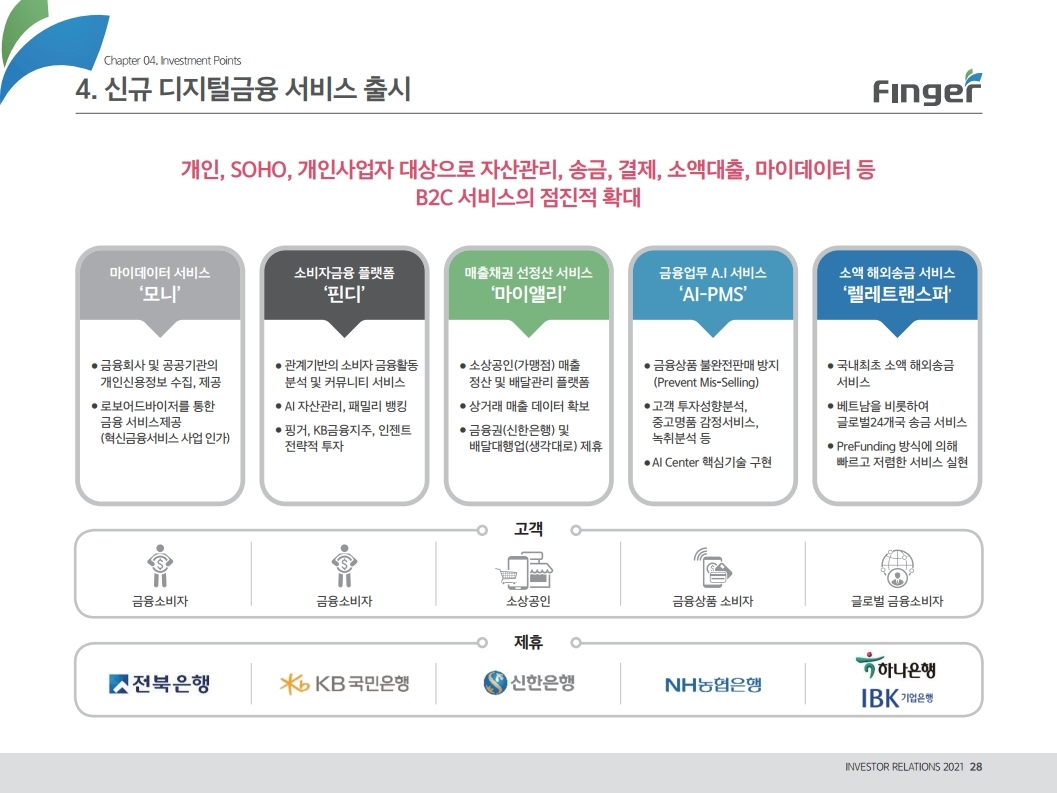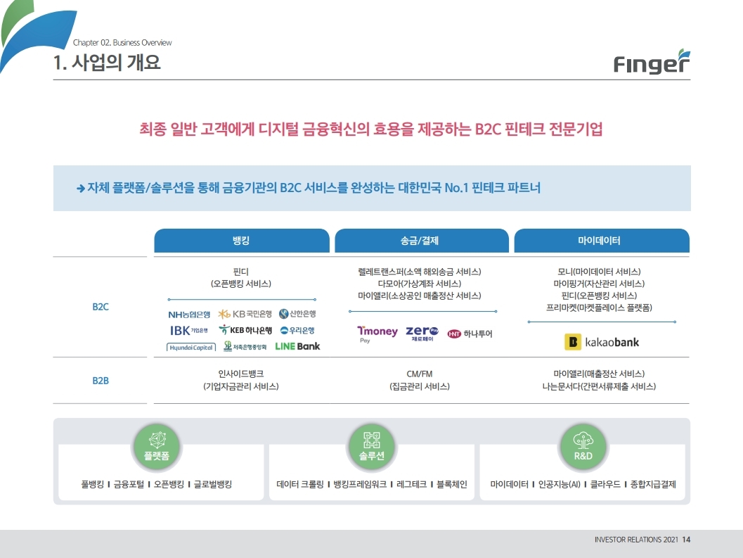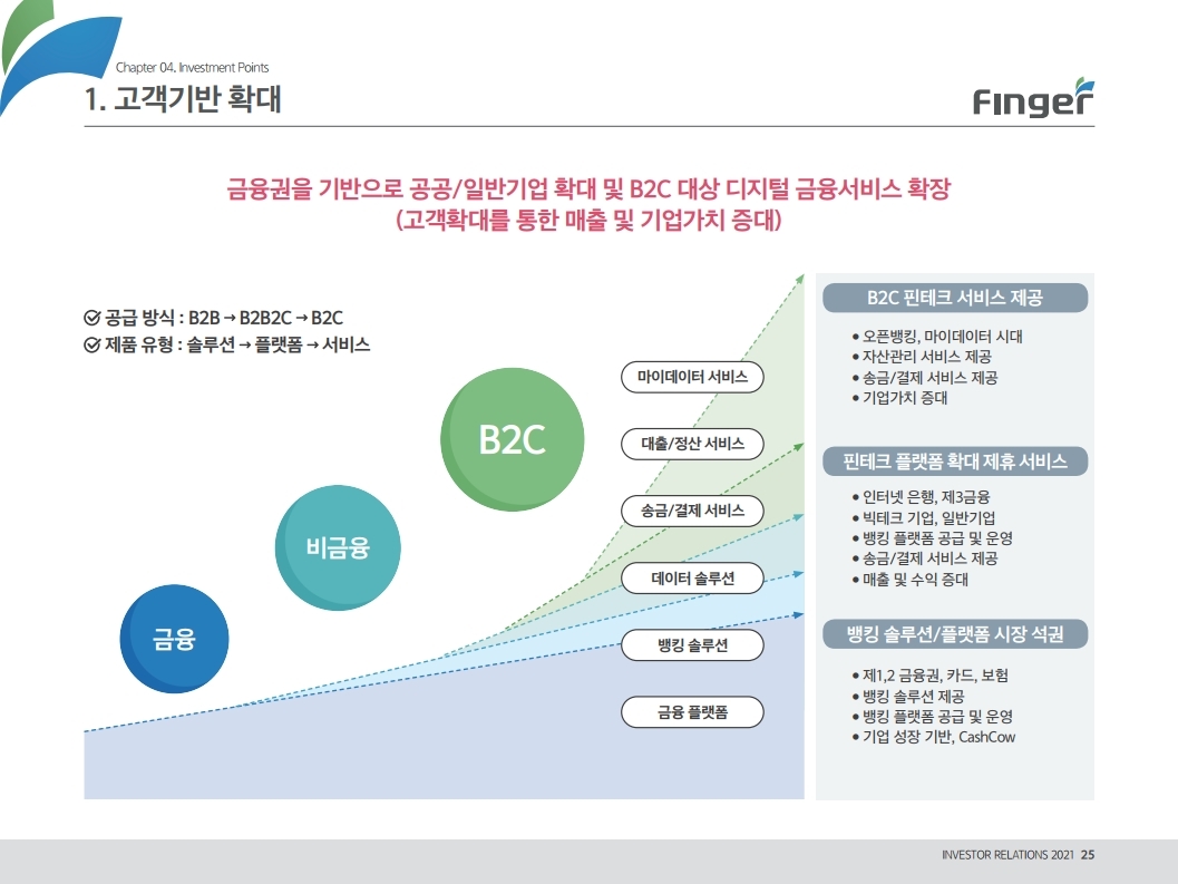 동사는 다양한 디지털 금융서비스의 공급/제휴/구축 레퍼런스를 보유하고 있으며, 디지털 및 데이터 생태계 강화를 위한 핀테크 원천기술을 보유함. 현재 금융권 B2B 풀뱅킹/금융포탈 플랫폼 중심의 사업에서 오픈뱅킹(한국 스마트카드, Amway 등), 글로벌뱅킹(라인 대만 등), 솔루션(AI기반 보이스 피싱 분석), 수수료(빅데이터중개, 해외송금) 등 비금융권, B2C 기반 매출 이 확대 중인 것에 주목해야 함. '21년 예상순이익 기준 공모희망가는 22.4~25.8배 수준임. 현재 마이데이터, 전자결제 서비스 중심으로 핀테크 산업은 고성장 중인데, '21년 1월 13일 동사의 자회사인 ㈜핀테크를 통해 마이데이터(본인신용정 보관리업) 예비허가를 받은 것도 투자시 참고해야할 긍정적인 부분임.