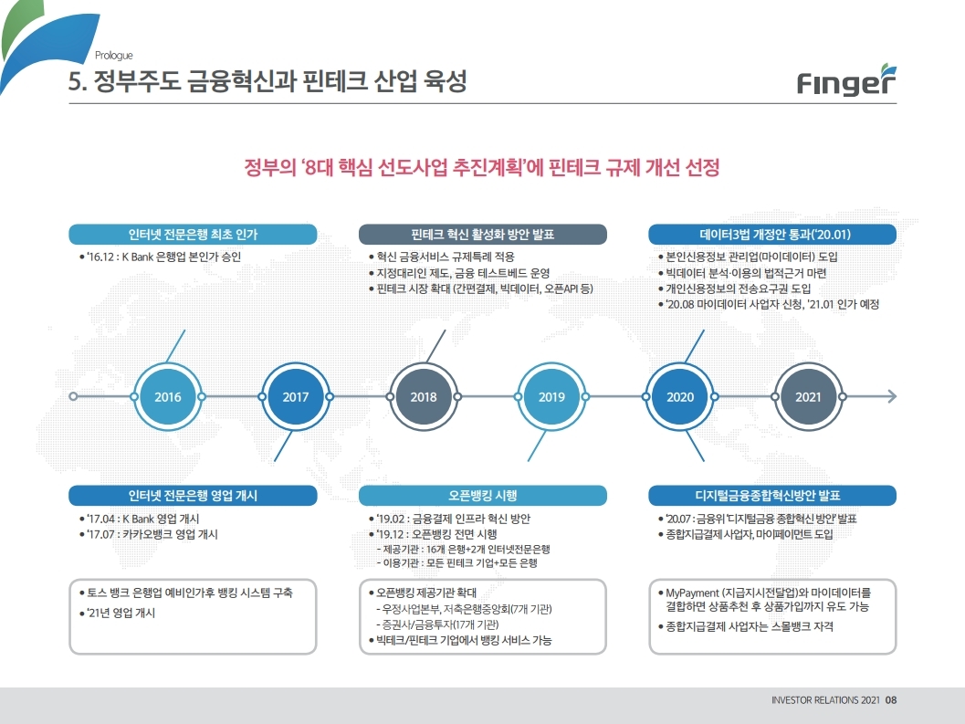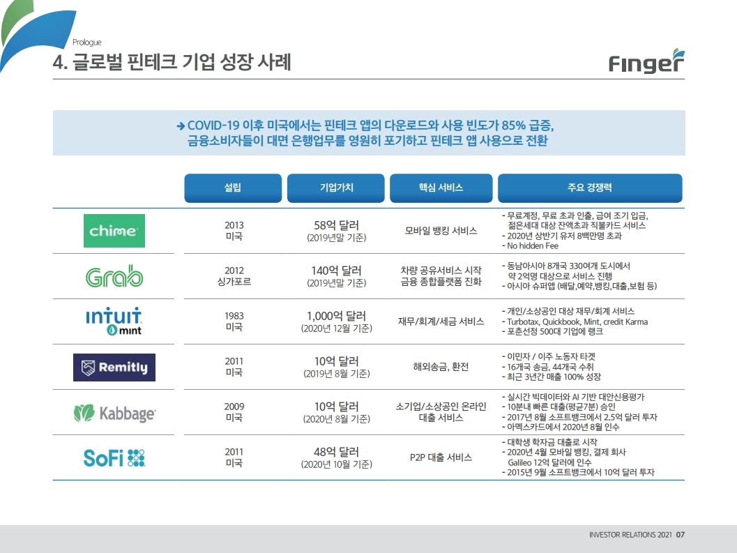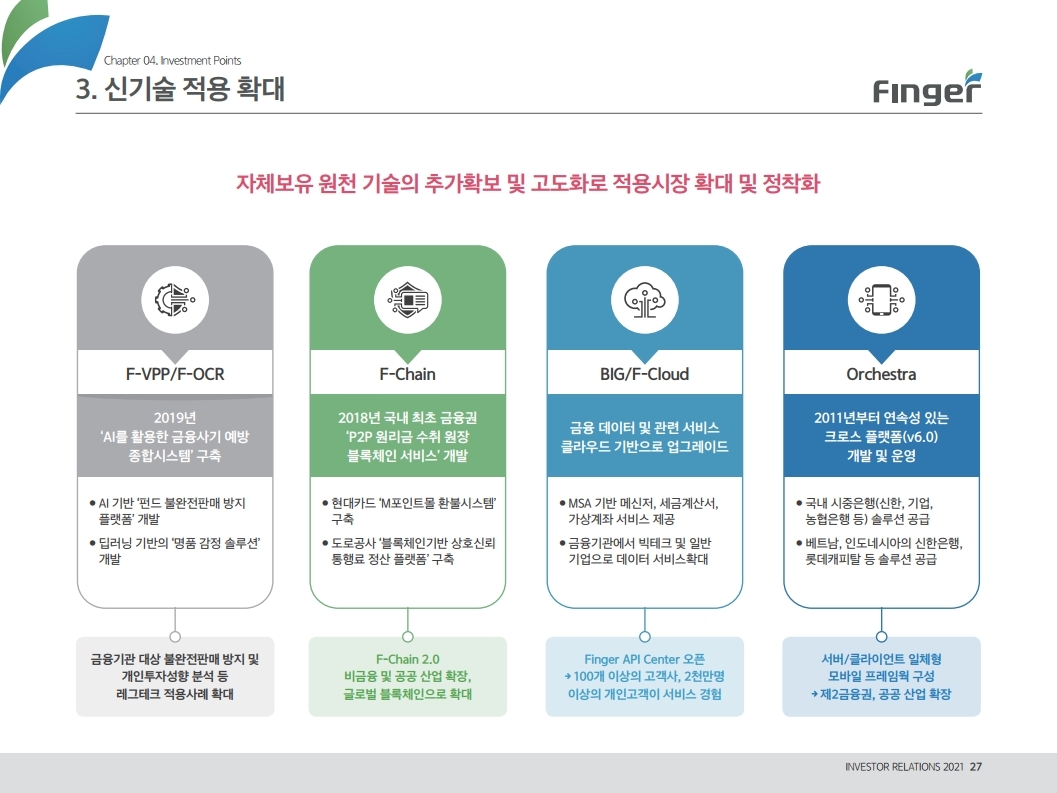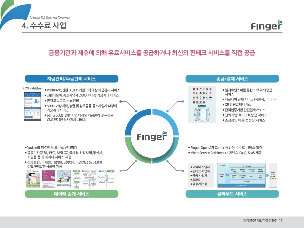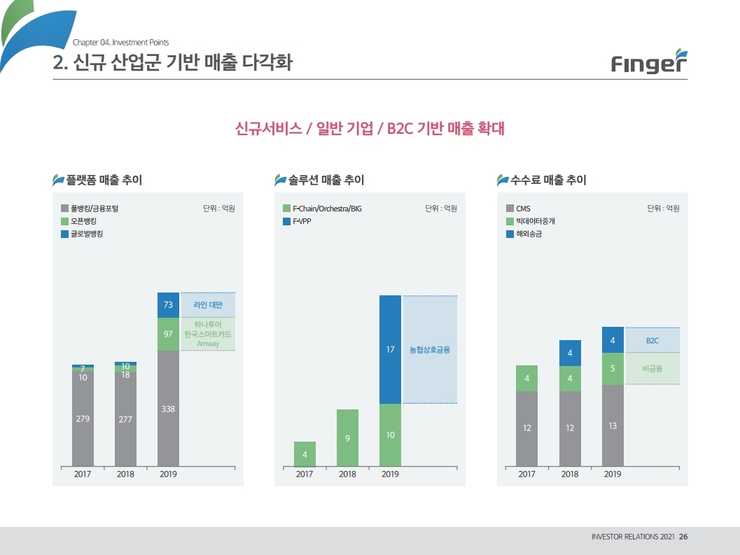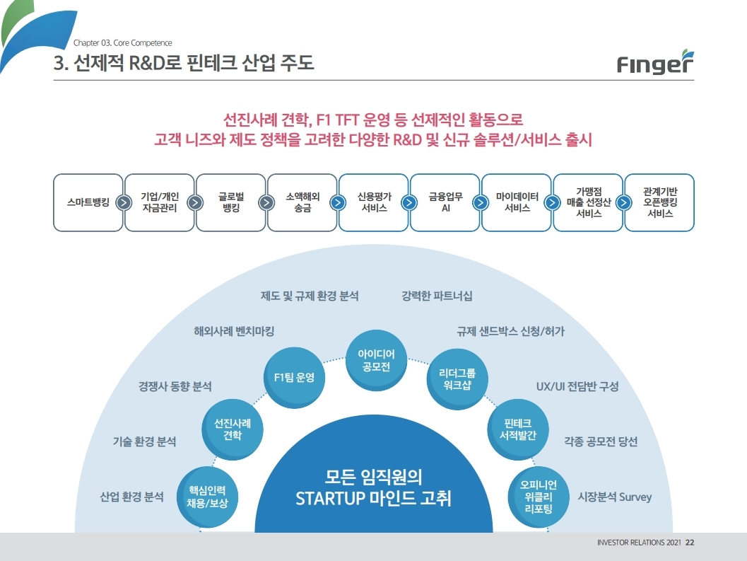 동사는 다양한 디지털 금융서비스의 공급/제휴/구축 레퍼런스를 보유하고 있으며, 디지털 및 데이터 생태계 강화를 위한 핀테크 원천기술을 보유함. 현재 금융권 B2B 풀뱅킹/금융포탈 플랫폼 중심의 사업에서 오픈뱅킹(한국 스마트카드, Amway 등), 글로벌뱅킹(라인 대만 등), 솔루션(AI기반 보이스 피싱 분석), 수수료(빅데이터중개, 해외송금) 등 비금융권, B2C 기반 매출 이 확대 중인 것에 주목해야 함. '21년 예상순이익 기준 공모희망가는 22.4~25.8배 수준임. 현재 마이데이터, 전자결제 서비스 중심으로 핀테크 산업은 고성장 중인데, '21년 1월 13일 동사의 자회사인 ㈜핀테크를 통해 마이데이터(본인신용정 보관리업) 예비허가를 받은 것도 투자시 참고해야할 긍정적인 부분임.