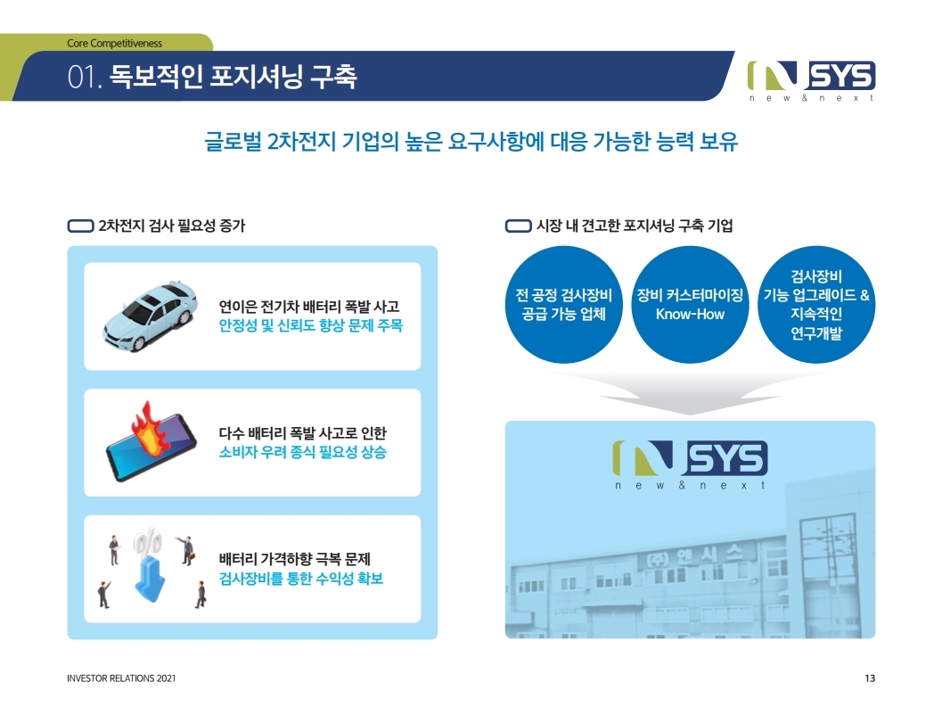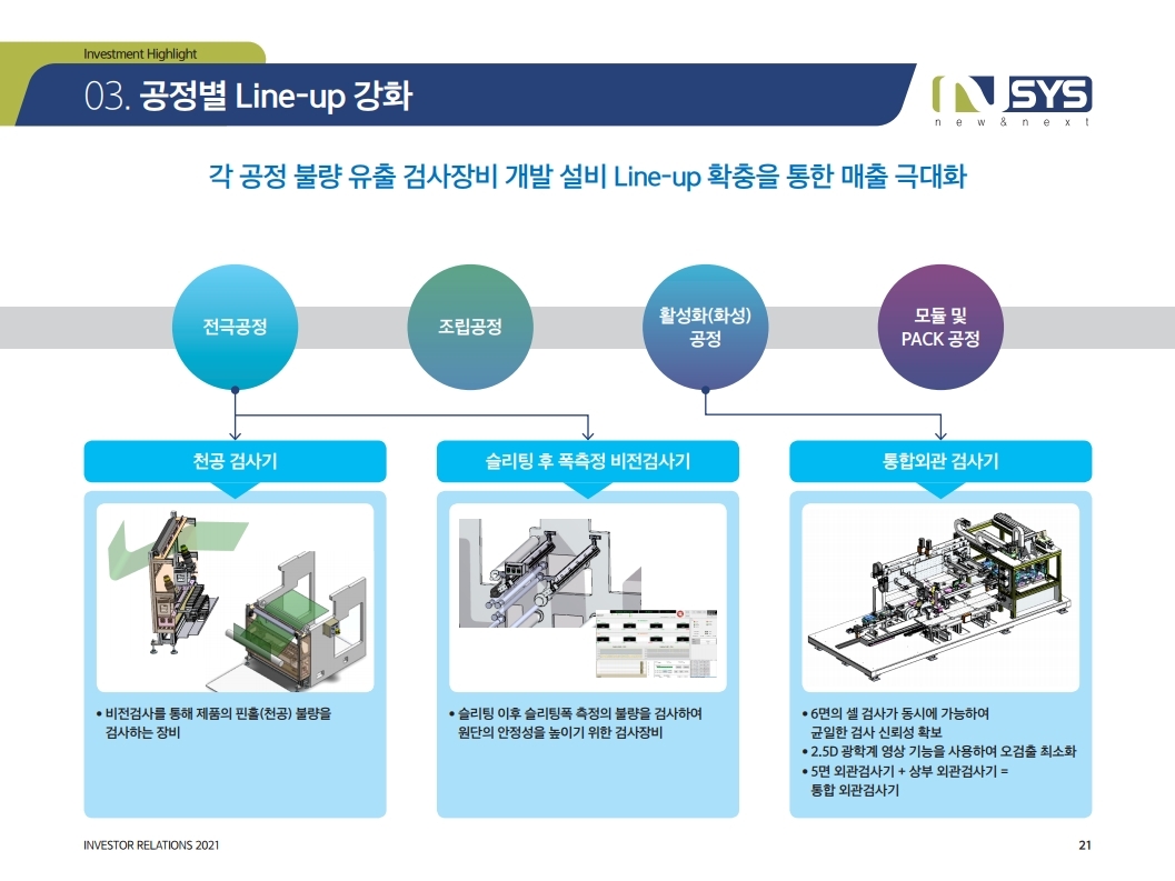 동사는 2006년 설립, 2차전지 생산 공정 별 비전검사장비를 주력 생산하고 있으며, 그외 태양전지 셀 및 모듈 장비 제조를 영위하고 있다. 국내 유일하게 2차전지 전공 정의 검사장비 Full-line Up를 갖추고 있으며, 공정 별로 전극공정, 조립공정, 활성 화공정, 모듈 및 Pack공정에 동사의 비전검사장비를 납품하고 있다. 2020년 기준 고 객 별 매출 비중은 LG에너지솔루션과 삼성SDI가 6: 4 비율이다. LG에너지솔루션에 는 전극공정 비전검사장비를, 삼성SDI에는 조립, 활성화, 모듈공정 비전검사장비를 공급하고 있다.