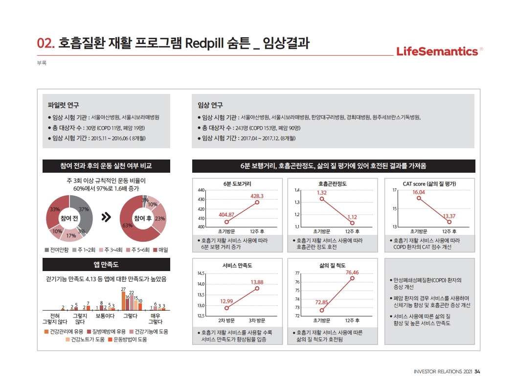 글로벌 디지털 치료제 시장이 연평균(2018~2025 년) 26.0% 성장하고 있는 가운데, 국내 정 부는 지속 가능한 건강보험체계 유지를 위해 규제개선 노력이 진행되고 있음. ① 호흡기 질환 자의 모니터링, 증상개선 및 활동량 증진유도 솔루션인 호흡질환 재활 프로그램인 “에필숨튼” 서비스를 시작함. ② 또한 암환자의 올바를 예후관리를 통한 삶의 질 향상 프로그렘인 “에필케 어” 서비스도 제공할 계획임. 이를 통한 월간 사용료 수취는 물론 치료관리 수행을 위한 산소 포화도계, 폐활량계 판매 등 수익구조 병행이 가능하여 실적 성장에 기여할 것임