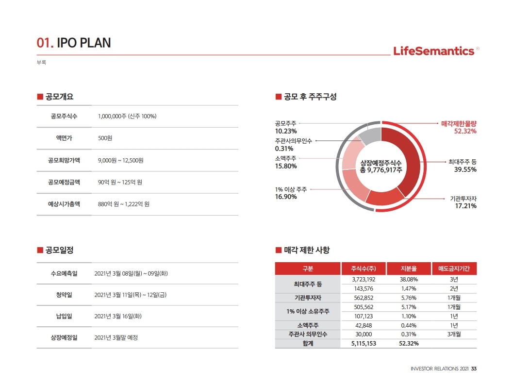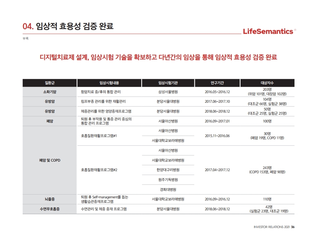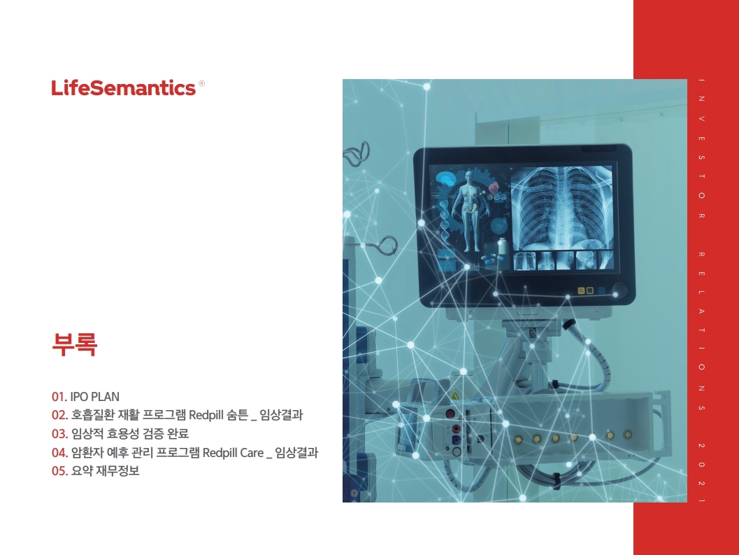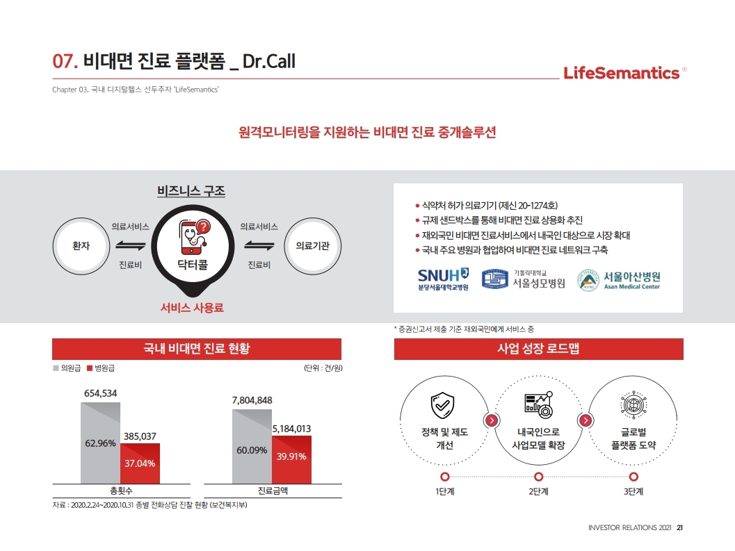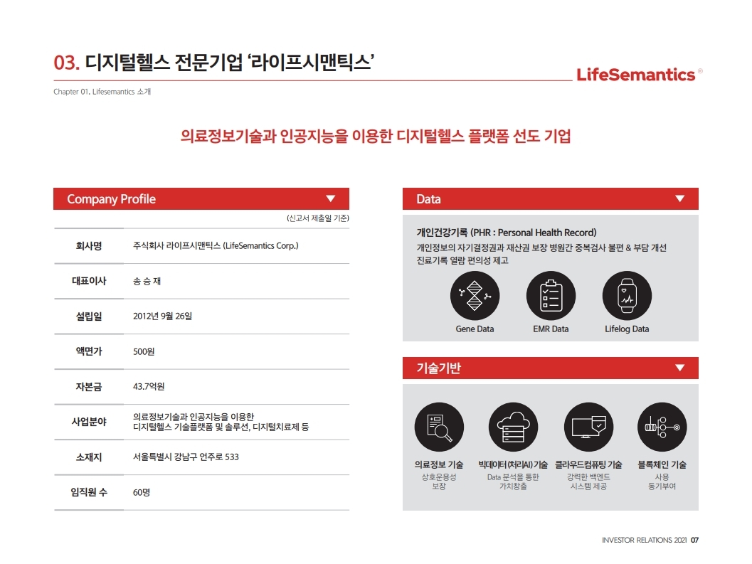 2012 년 법인 설립. 2014 년에 ICT컨버전스연구소 설립. 2015 년 산업자원부 주관 “개인맞춤 형 건강관리시스템 사업단(총 공사비 115 억원)” 주관기관 선정. 2017 년 PIMS(개인정보보호 관리체계) 인증 완료. 2018 년 HIPAA(미국 의료정보보호법) 인증 완료. 코스닥 기술성장기업 (사업모델기업) 특례를 적용 받아 3월 23 일 신규상장 예정임. 2019년 기준, 매출비중은 디지털헬스 기술플랫폼 사업이 100%임. 사업이 본격화되는 2023 년 기준, 디지털헬스 기술플랫폼 30.1%, 디지털헬스 솔루션 39.3%, 디지털치료제 30.6% 를 차지할 것으로 전망함. 공모 후 주주 비중은 최대주주 등 특수관계인 39.5%, 벤처금융 12.7%, 전문투자자 4.5%, 1% 이상 주주 16.9%, 상장주선인 0.3%, 기타주주 15.8%, 공모주주(기관+일반) 10.2%.