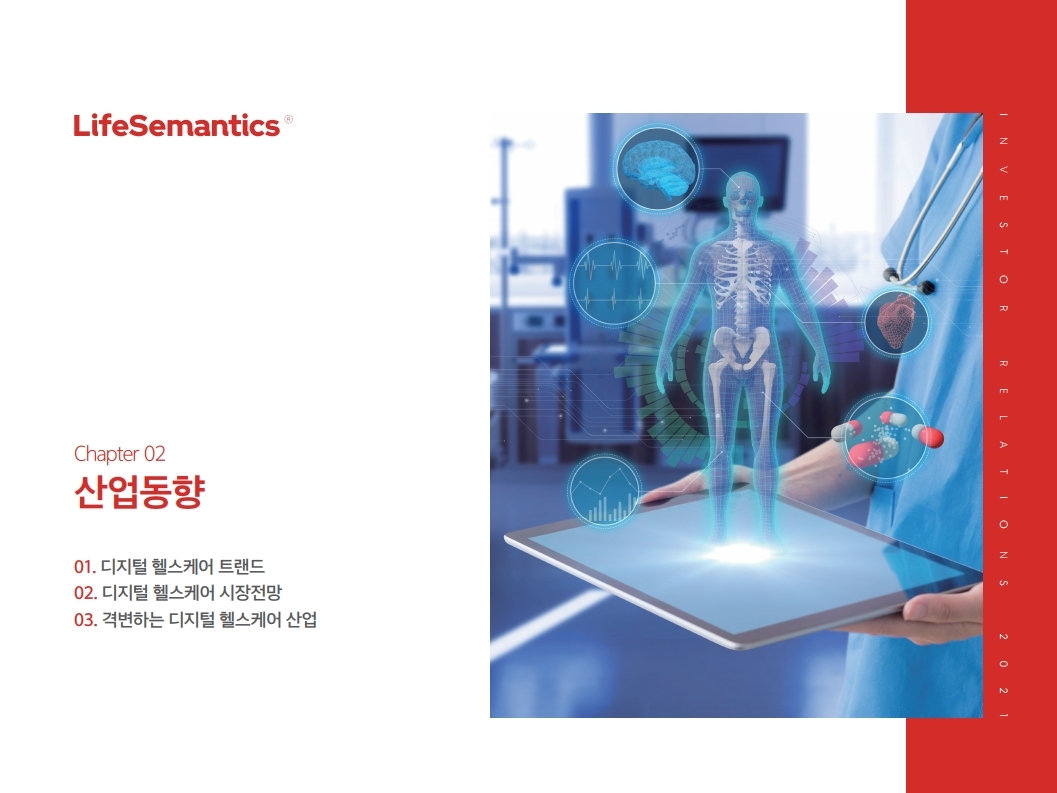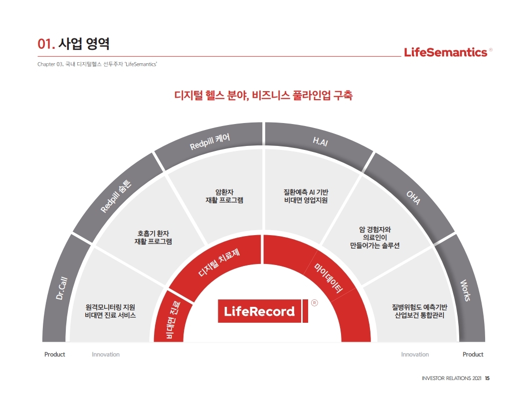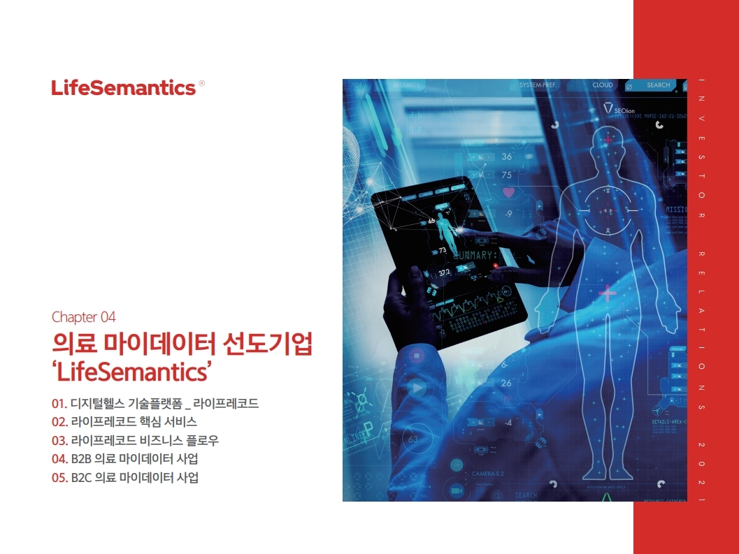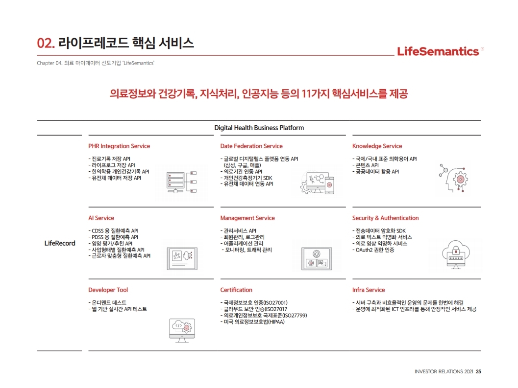 연평균(2017~2024 년) 15.5%씩 성장하고 있는 글로벌 디지털헬스케어 시장에서 동사는 “라 이프레코드”라는 디지털헬스 기술플랫폼을 기반으로 성장을 지속할 것으로 전망함. ① 의료정 보, 건강기록, 지식처리, 인공지능 등의 11 가지 핵심서비스를 제공하는 라이프레코드 플랫폼 을 기반으로, B2B, B2C 의료 마이데이터 서비스를 제공하여 수익을 발생할 예정임. ② 최근 B2B 의료 마이데이터 사업을 위해 보험, 헬스케어, 건설, 클라우드 분야의 주요기업과 계약을 체결함. ③ 또한 B2C 의료 마이데이터 사업을 위해 개인 건강데이터 기반, 헬스케어 서비스 제공을 준비하고 있음.