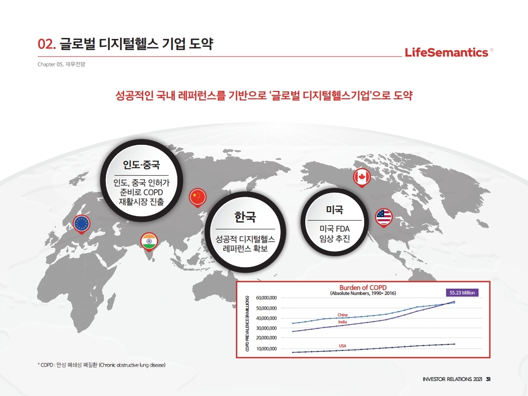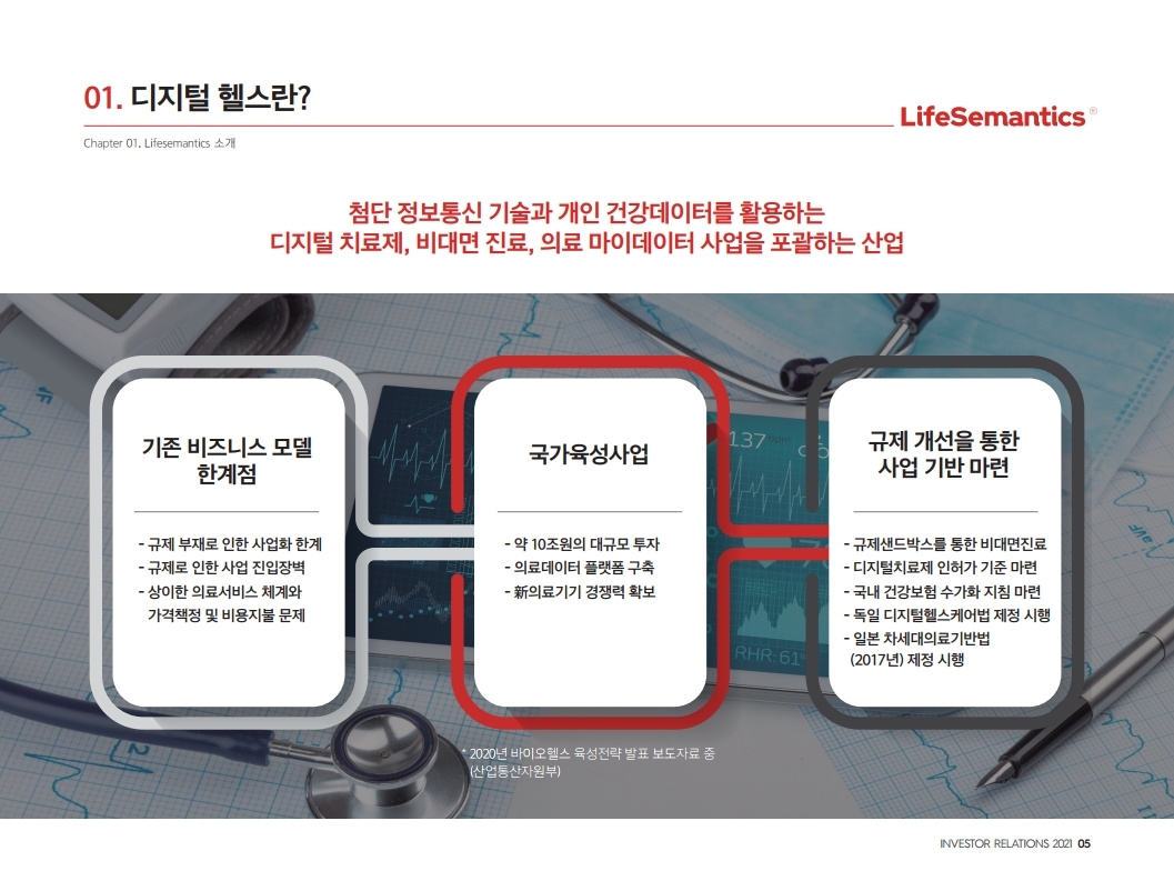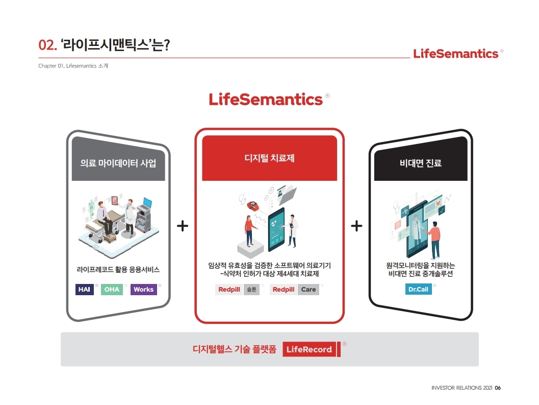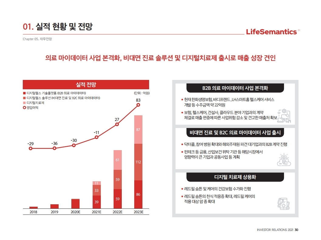 연평균(2017~2024 년) 15.5%씩 성장하고 있는 글로벌 디지털헬스케어 시장에서 동사는 “라 이프레코드”라는 디지털헬스 기술플랫폼을 기반으로 성장을 지속할 것으로 전망함. ① 의료정 보, 건강기록, 지식처리, 인공지능 등의 11 가지 핵심서비스를 제공하는 라이프레코드 플랫폼 을 기반으로, B2B, B2C 의료 마이데이터 서비스를 제공하여 수익을 발생할 예정임. ② 최근 B2B 의료 마이데이터 사업을 위해 보험, 헬스케어, 건설, 클라우드 분야의 주요기업과 계약을 체결함. ③ 또한 B2C 의료 마이데이터 사업을 위해 개인 건강데이터 기반, 헬스케어 서비스 제공을 준비하고 있음.