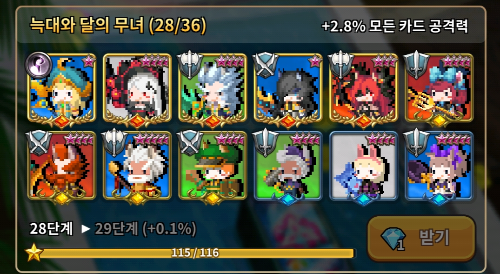 물론 저는 각성까지 시켜놓은 상태로 레벨이 99로 고정이되는 실험실 컨텐츠에서 늑대덱을 사용하고 있습니다. 실험실에서 사용하면 재밌습니다! 일단 '루나' 를 필두로 한 주요 전설 카드가 '카자 카', '로잘린 카', '테즈 카', '엘리자베스' 까지 5장정도가 되는군요. 생각보다 필요한 전설카드 숫자가 많군요. 하지만 그외 카의 일족 카드들은 희귀~영웅 등급이기 때문에 골드만 넉넉하다면 골드뽑기를 통해서 수급이 어느정도 가능한 장점을 가지고 있습니다.