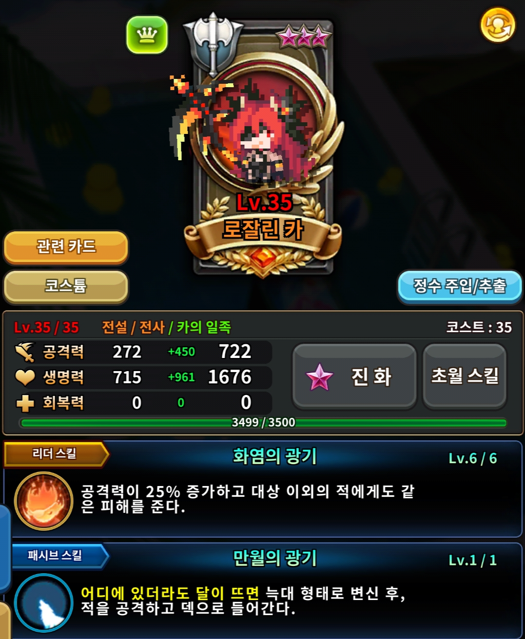 로잘린 카! 카의 일족으로 지원카드 형식으로 추가된 카드입니다. 리더스킬인 '화염의 광기' 는 공격력이 25% 증가하고 대상 이외의 적에게도 같은 피해를 준다라고 되어있어 로잘린 카에게만 적용되는 듯 하지만, 사실 이 스킬은 공격하는 3장의 카드 모두에게 적용되기 때문에 공격 늑대 카드 모두에게 전체 공격 효과를 부가해줄 수 있습니다. 단체공격이 중요한 실험실 컨텐츠 같은 경우에 핵심인 카드입니다.