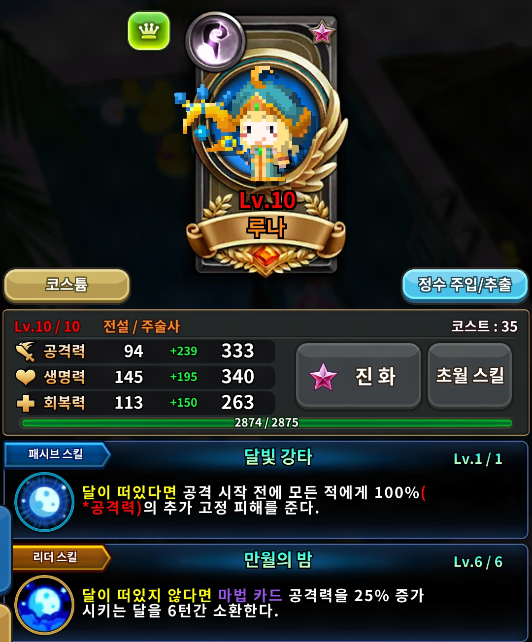 루나! 늑대덱의 시작입니다. 루나의 '만월의 밤' 이 시작되면 카의 일족 카드군이 단체로 튀어나와서 늑대화 되면서 덱으로 들어가게 되는데 그럼 늑대카드들로 활용이 가능합니다. 참고로 만월의 밤은 6턴짜리 장판형 스킬이고, 만월의 밤이 깔린 상태라면 마법데미지가 25% 상승하는 효과가 있습니다. 그래서 마딜러를 주축으로하는 덱에는 버퍼로 들어가기도 하고, 카의일족이 대부분 전사군이기 때문에 부족한 딜을 채우기 위해 마법사를 활용하는 늑대덱에 있어서 좋은 시너지를 내고 있습니다.