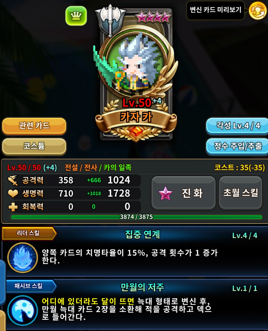 카자 카! 공격 시 가운데에 위치하여 리더스킬을 쓰면 양쪽 카드 치명타율과 공격횟수가 증가하는 '집중 연계'라는 리더스킬을 가지고 있습니다. 좌우에 늑대카드들을 활용해서 총 5타를 노리며 딜을 뽑아낼 때 핵심이 되는 카드입니다.