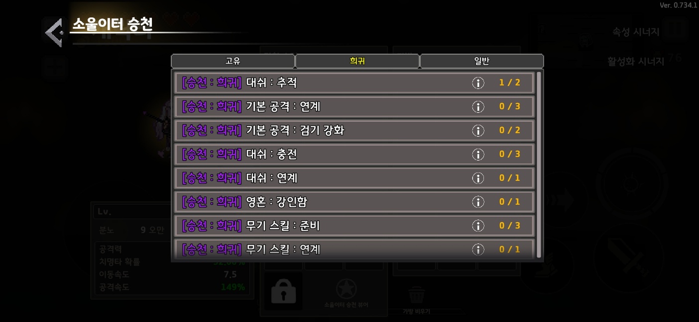 소울이터는 매우 제한적인 스킬과 유물만 사용할 수 있습니다. '승천' 이라는 독자적인 시스템을 통해서 유물 또는 스킬을 버리거나 사냥을 하면서 레벨업을 하는 시스템이죠. 따라서 스킬은 암흑시너지를 맞춰줄 수 있는 스킬과 암흑속성을 가지고 있는 버프를 두면 됩니다. 이미지에서는 딱히 아이템을 건저낸것이 없어서... 아래를 참고해주시면 될 것 같습니다.