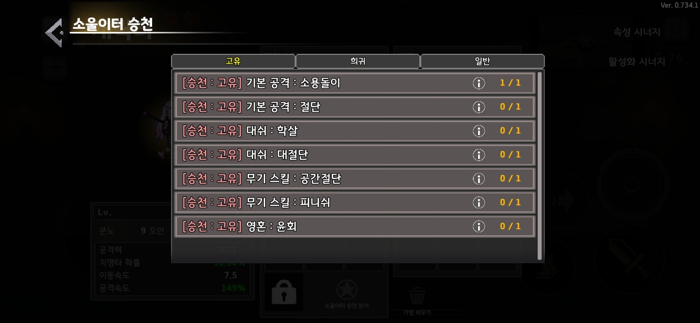 소울이터는 사용가능한 유물이 매우 한정적입니다. 특히, 스킬은 사용이 불가능하고 버프도 일부만 사용이 가능하죠. (인게임에서 확인 가능) 굉장히 제한적이기는 하지만 자체적인 레벨업 시스템을 통해서 특성등을 찍어나가면서 성장하는 캐릭터입니다. 그래도 가장 마음에 드는 것은 압도적인 공속을 기반으로한 치명타 데미지를 넣을 수 있다는 호쾌한 캐릭터 이기도 하죠.